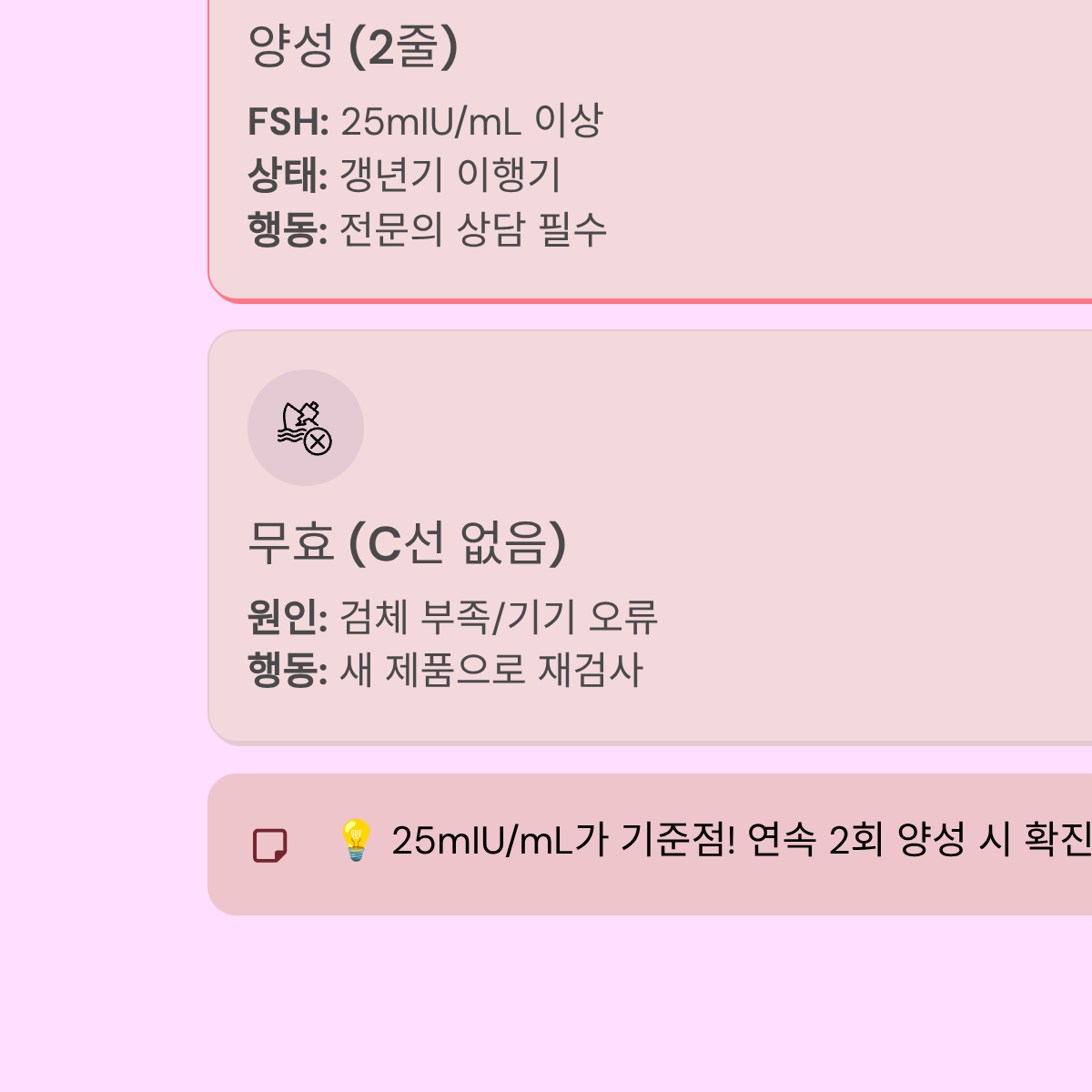 | 양성 (2줄) | 25mIU/mL 이상 | 갱년기 이행기 또는 폐경 | 전문의 상담 및 정밀 검사 |