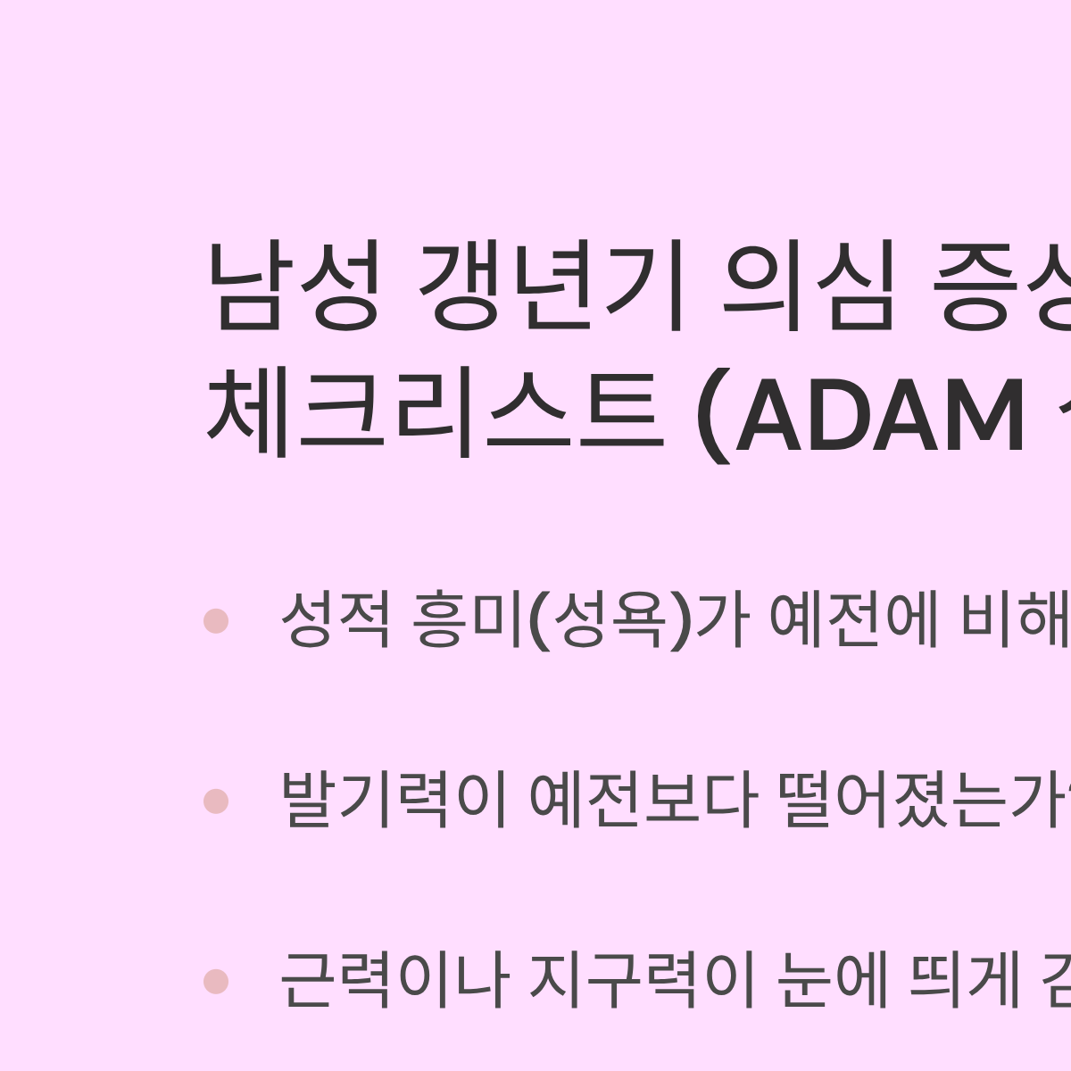 아래 체크리스트는 전 세계적으로 통용되는 ADAM(Androgen Deficiency in the Aging Male) 설문지를 기반으로 구성되었습니다.