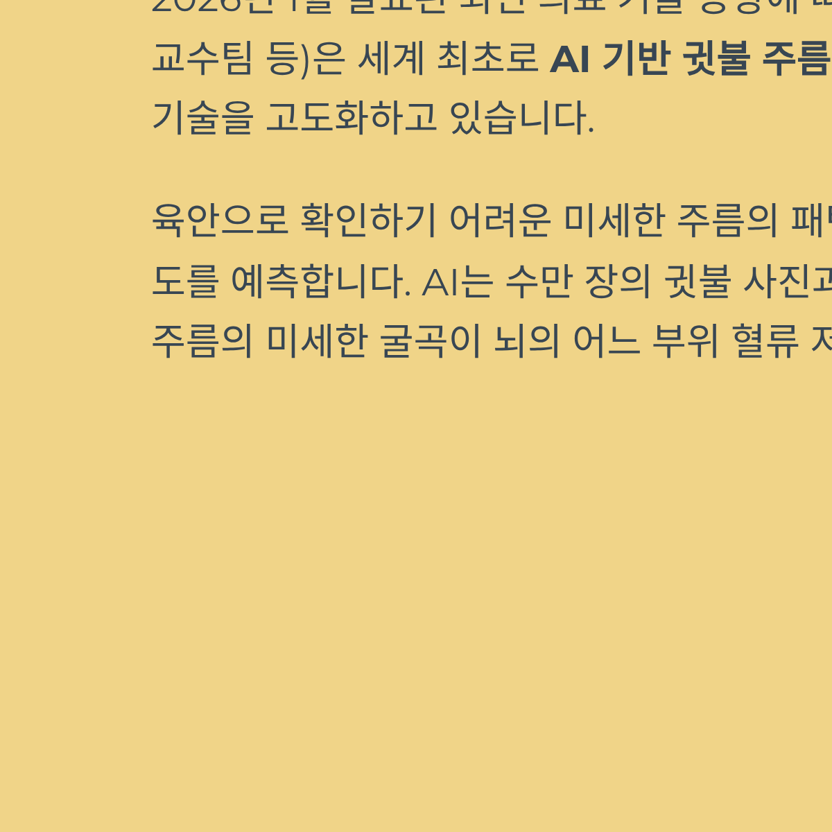 A: 최근 국내 연구진이 개발한 AI 모델은 귓불 주름의 형태와 깊이를 분석해 뇌 미세혈관 손상 여부를 높은 정확도로 예측합니다. 이는 육안으로 놓치기 쉬운 미세한 변화를 감지하여 치매나 뇌졸중 고위험군을 조기에 선별하는 데 기여하고 있습니다.