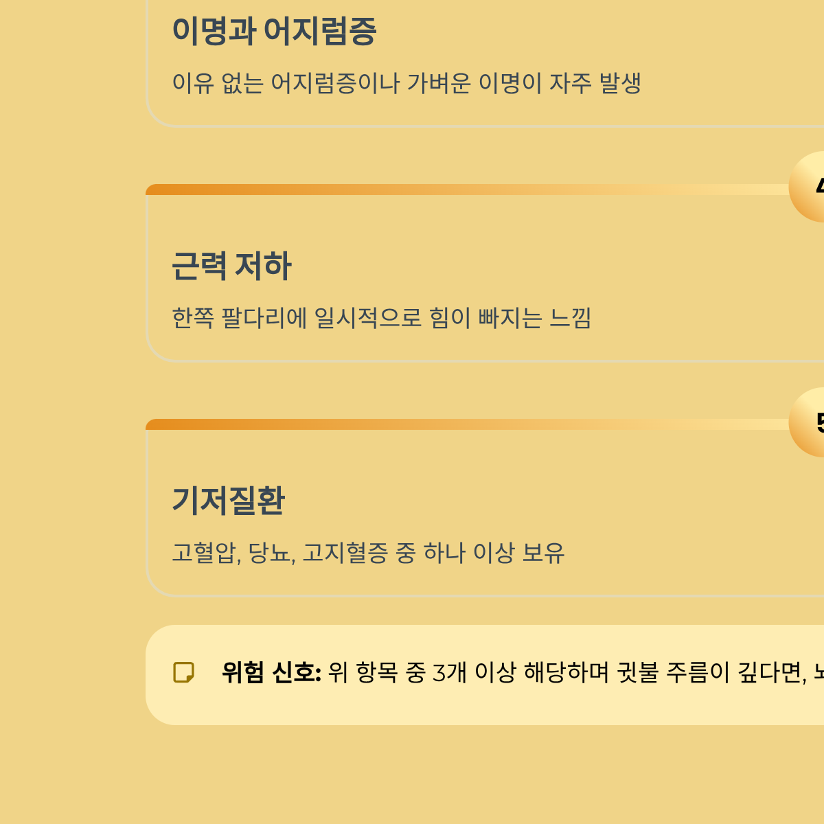 - 인사이트: 위 항목 중 3개 이상 해당하며 귓불 주름이 깊다면, 뇌 미세혈관 변성(Microvascular Degeneration)이 진행 중일 가능성이 큽니다.
