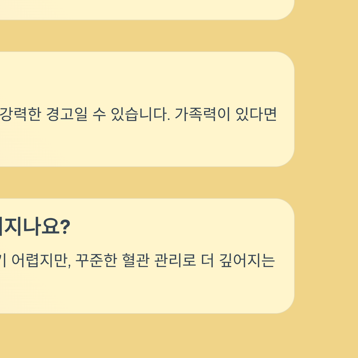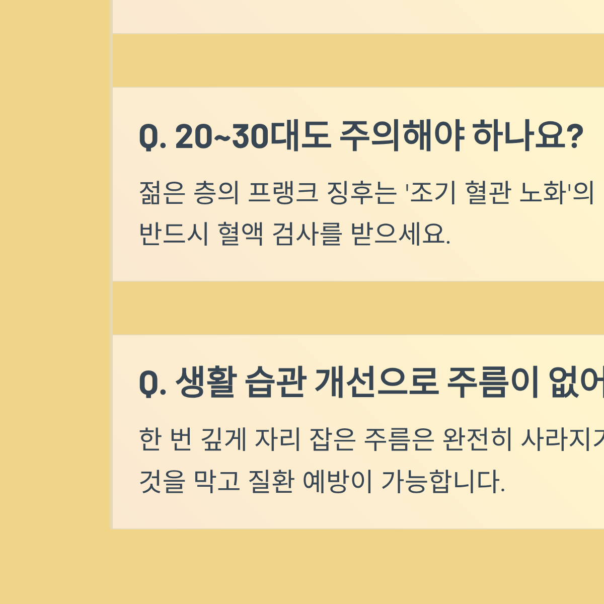 A: 젊은 층에서 발견되는 프랭크 징후는 노화에 의한 자연스러운 현상일 확률이 낮아, 오히려 '조기 혈관 노화'의 강력한 경고일 수 있습니다. 가족 중 심장 질환자가 있거나 평소 식습관이 좋지 않다면 반드시 혈액 검사를 통해 이상 지질 혈증 여부를 확인해야 합니다.