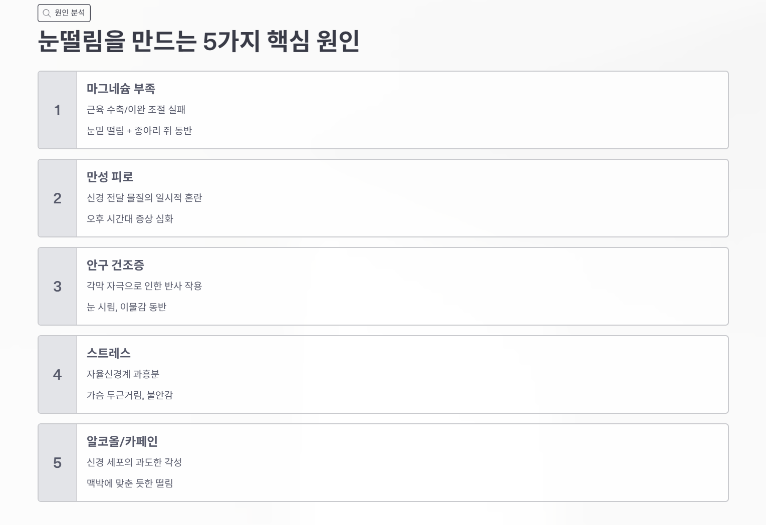 눈떨림은 단일 원인보다는 여러 요인이 복합적으로 작용하여 나타납니다. 경쟁 콘텐츠들이 단순히 '원인 리스트'만 나열했다면, 아래 표는 각 원인이 근육에 미치는 메커니즘과 그에 따른 핵심 판단 기준을 분석한 결과입니다.