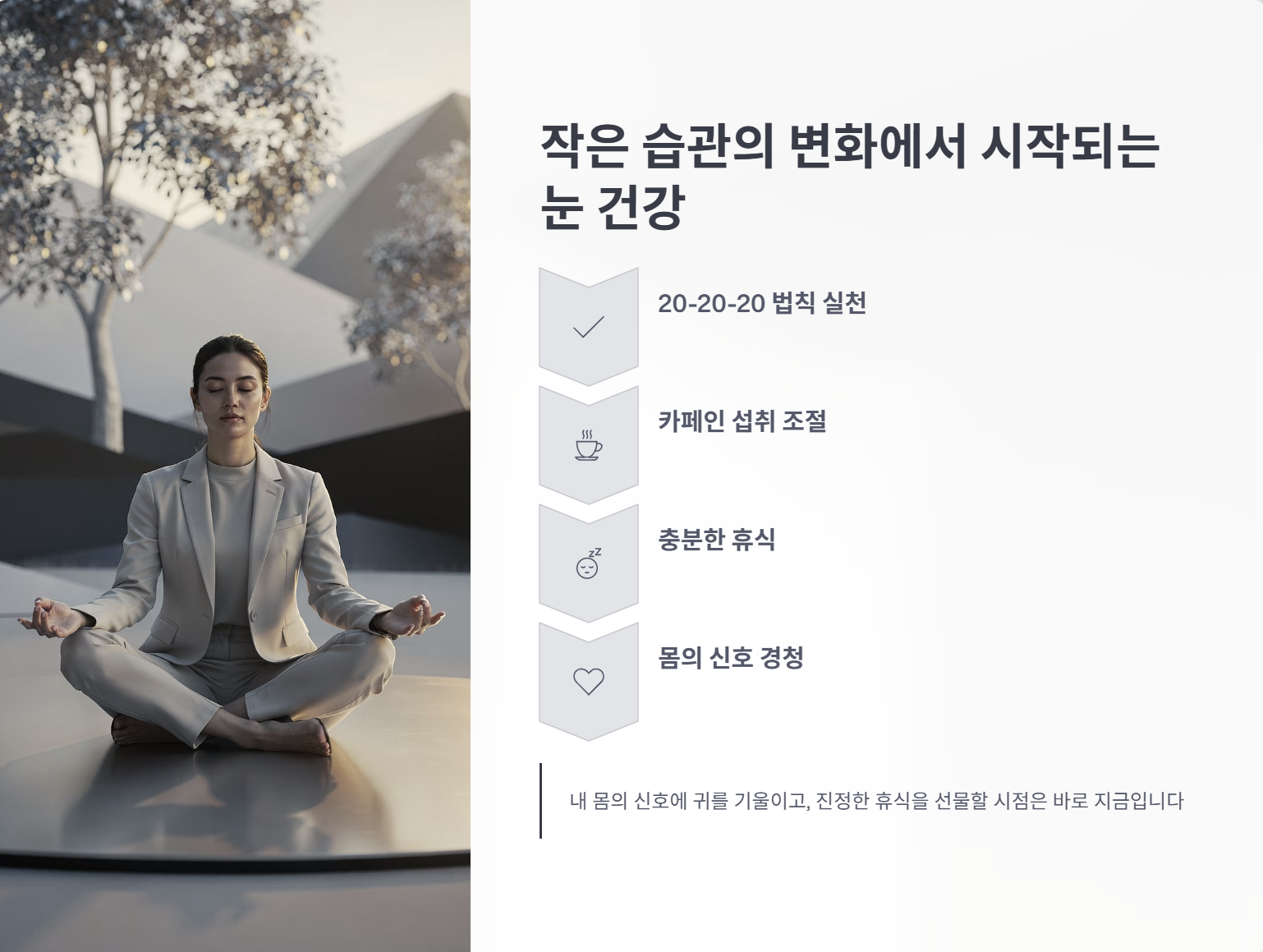 본 콘텐츠는 단순 증상 나열을 넘어, 즉각적인 피로 완화를 위한 '20-20-20 법칙'과 실패 없는 영양제 선택 기준 등 실질적인 솔루션을 제공하는 데 집중했습니다. 지금 느끼는 미세한 떨림을 방치하여 만성적인 안면 질환으로 키우기보다, 오늘 배운 생활 관리법을 하나씩 실천해 보시기 바랍니다. 여러분의 눈 건강은 작은 습관의 변화에서 시작됩니다. 내 몸의 신호에 귀를 기울이고, 진정한 휴식을 선물할 시점은 바로 지금입니다.