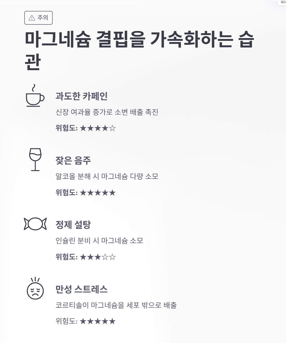 | 과도한 카페인 섭취 | 신장의 여과율을 높여 소변으로 마그네슘 배출 촉진 | ★★★★☆ | 하루 3잔 이상 커피는 '마그네슘 킬러' |