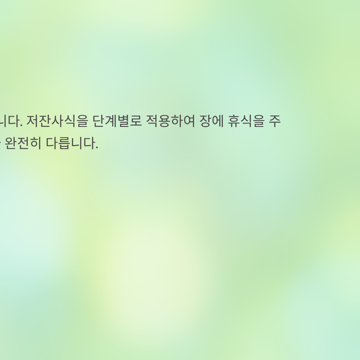 대장내시경 후 장은 마치 '껍질이 벗겨진 상태'와 같습니다. 강한 장 정결제로 인해 유익균이 일시적으로 씻겨 내려갔고, 내시경 기구의 마찰로 점막이 예민해져 있기 때문입니다. 따라서 '저잔사식(Low-residue diet, 섬유질이 적어 대변량을 줄이는 식사)'을 단계별로 적용하여 장에 휴식을 주어야 합니다.