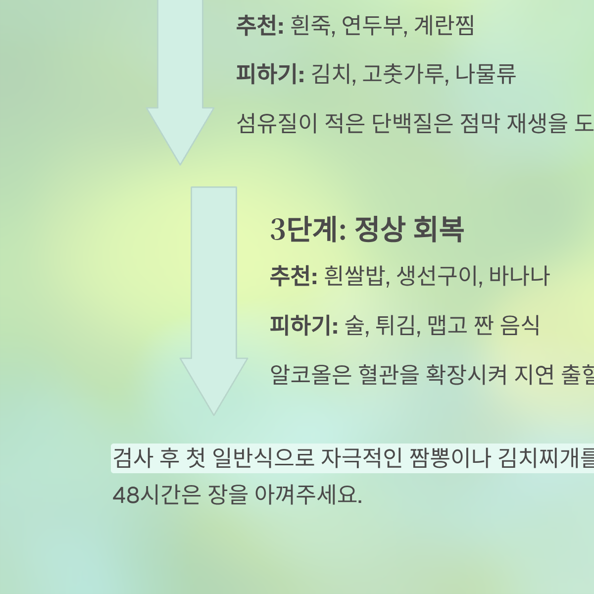 | 3단계: 정상 회복 | 흰쌀밥, 생선구이, 바나나 | 술, 튀김, 맵고 짠 음식 | 알코올은 혈관을 확장시켜 지연 출혈 유발 |
