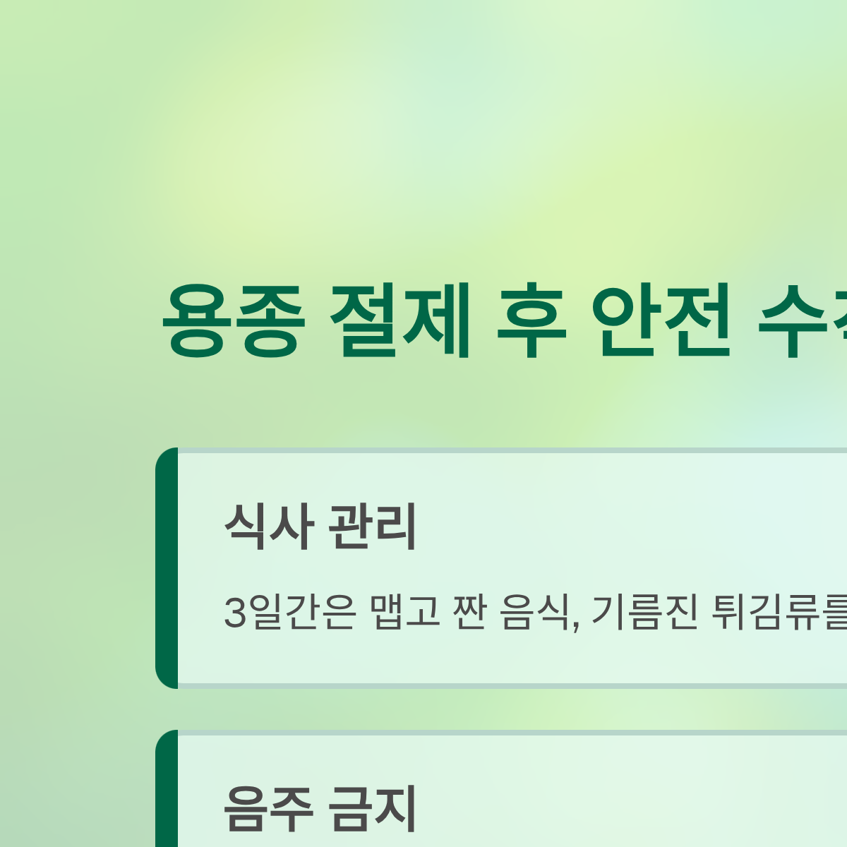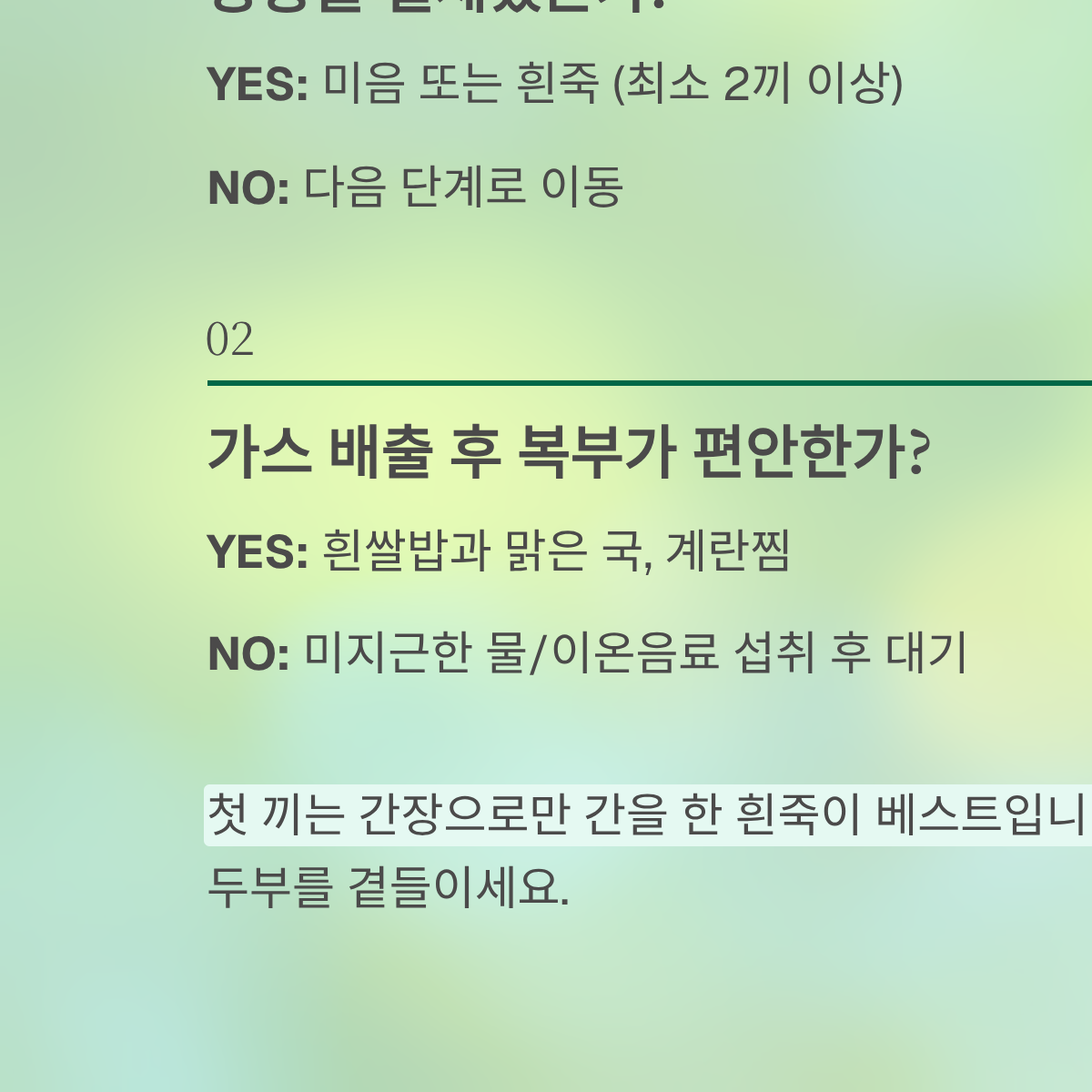 - No ➔ [1단계] 1시간 후 이온음료 ➔ [2단계] 첫 끼니 흰죽 ➔ [3단계] 다음 끼니부터 부드러운 일반식
