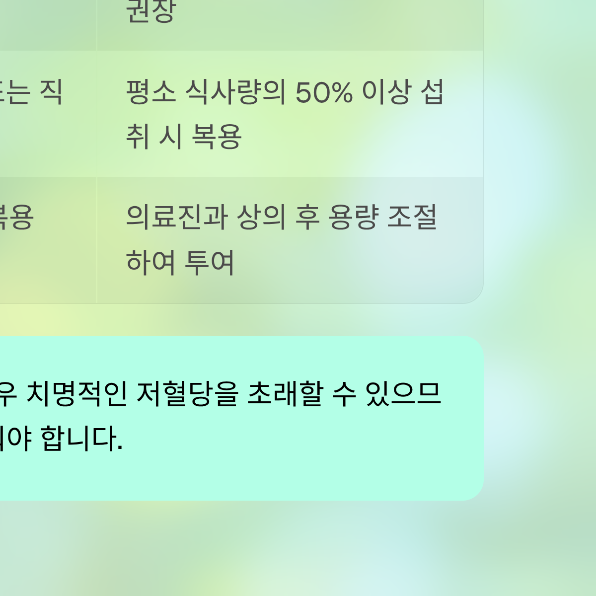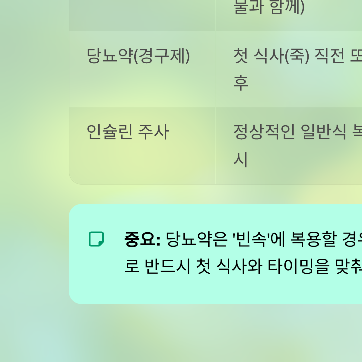 | 당뇨약(경구제) | 첫 식사(죽) 직전 또는 직후 | 탄수화물 섭취량 확인 | 평소 식사량의 50% 이상 섭취 시 복용 |