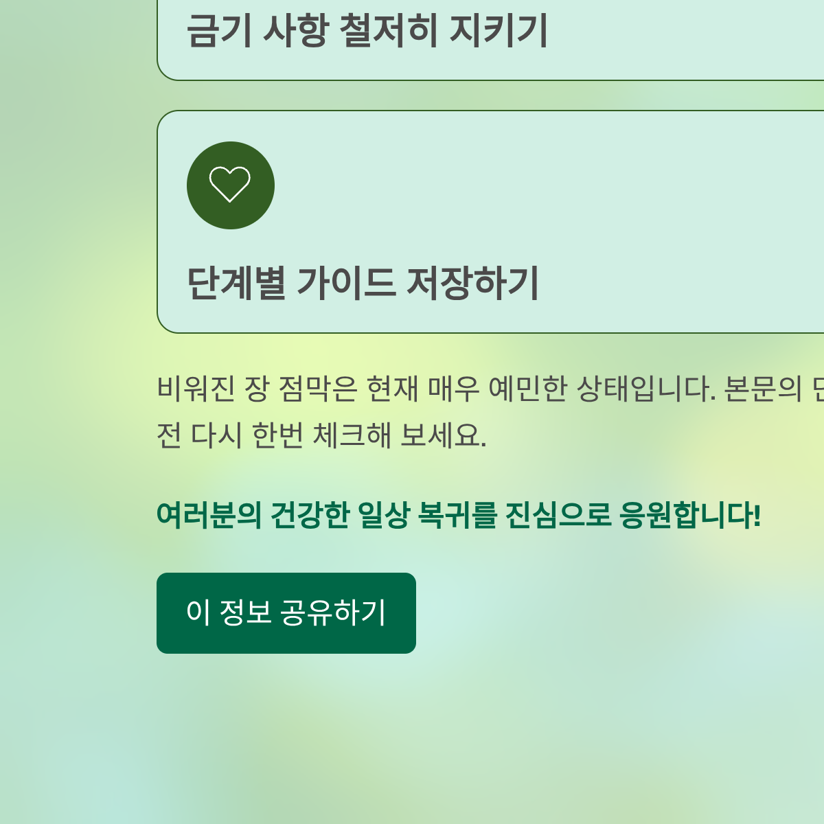 비워진 장 점막은 현재 매우 예민한 상태입니다. 오늘 정리해 드린 7일간의 식사 원칙과 금기 사항을 철저히 준수하신다면, 합병증 없는 완벽한 회복을 경험하실 수 있습니다. 지금 바로 본문의 '단계별 식사 가이드'를 저장해 두시고, 첫 끼니를 준비하기 전 다시 한번 체크해 보세요. 여러분의 건강한 일상 복귀를 진심으로 응원합니다.