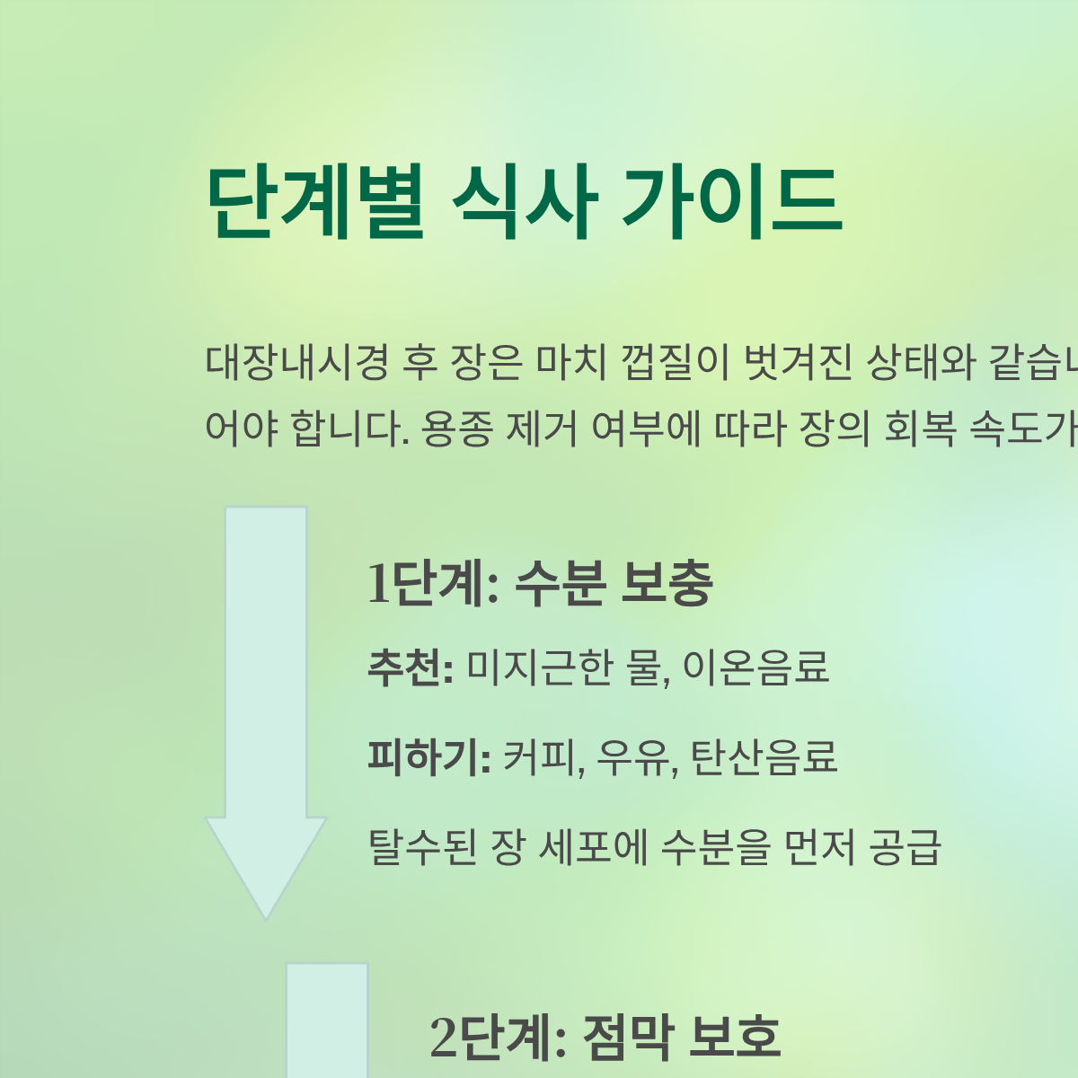 | 2단계: 점막 보호 | 흰죽, 연두부, 계란찜 | 김치, 고춧가루, 나물류 | 섬유질이 적은 단백질은 점막 재생을 도움 |
