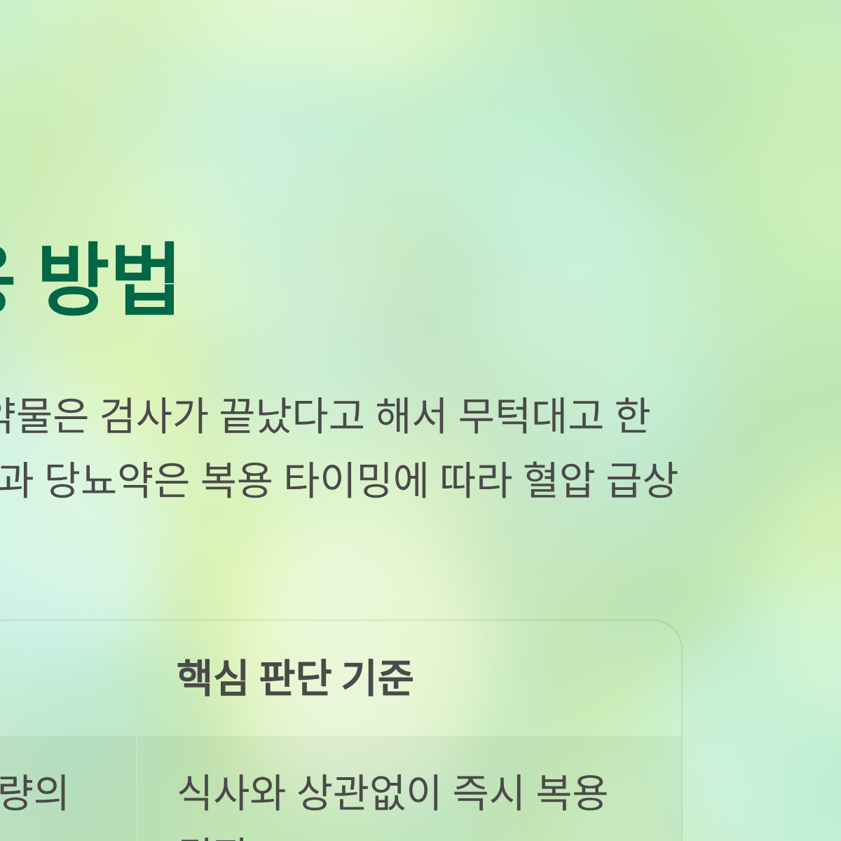 | 혈압약 | 검사 종료 직후 (소량의 물과 함께) | 혈압 안정화 및 뇌혈관 질환 예방 | 식사와 상관없이 즉시 복용 권장 |