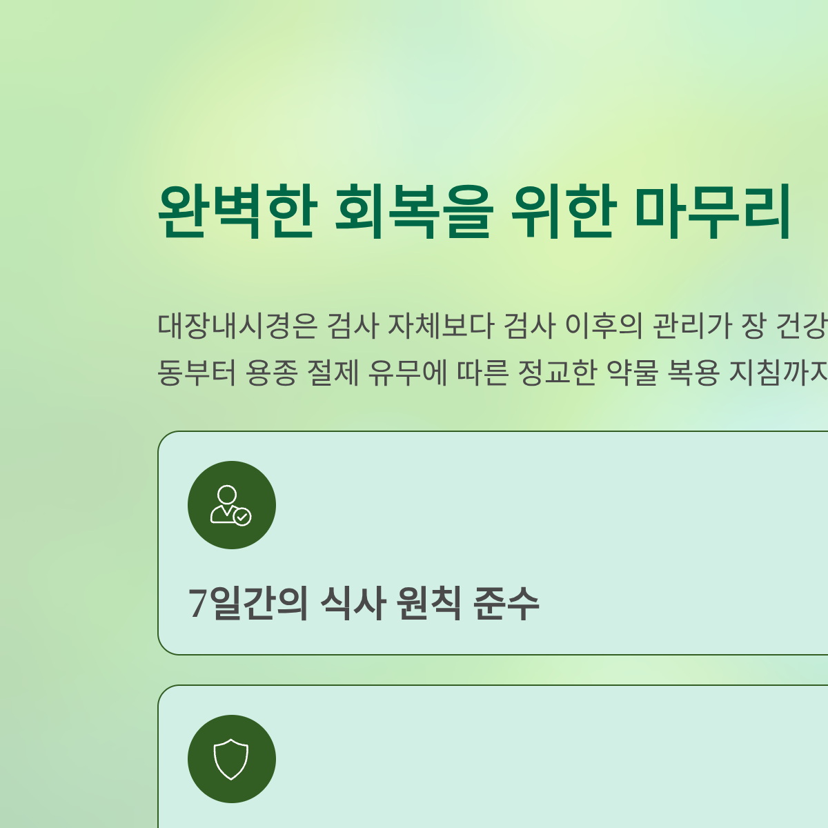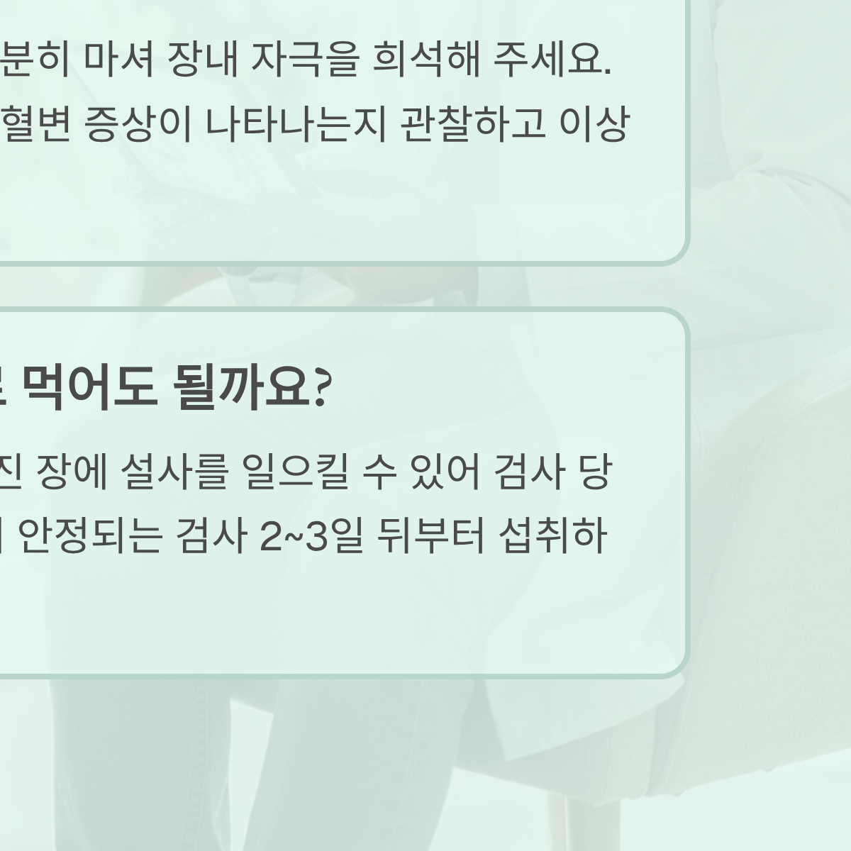 * 용종 미제거 시: 검사 1시간 후 가스 배출이 원활하면 가벼운 식사 가능.