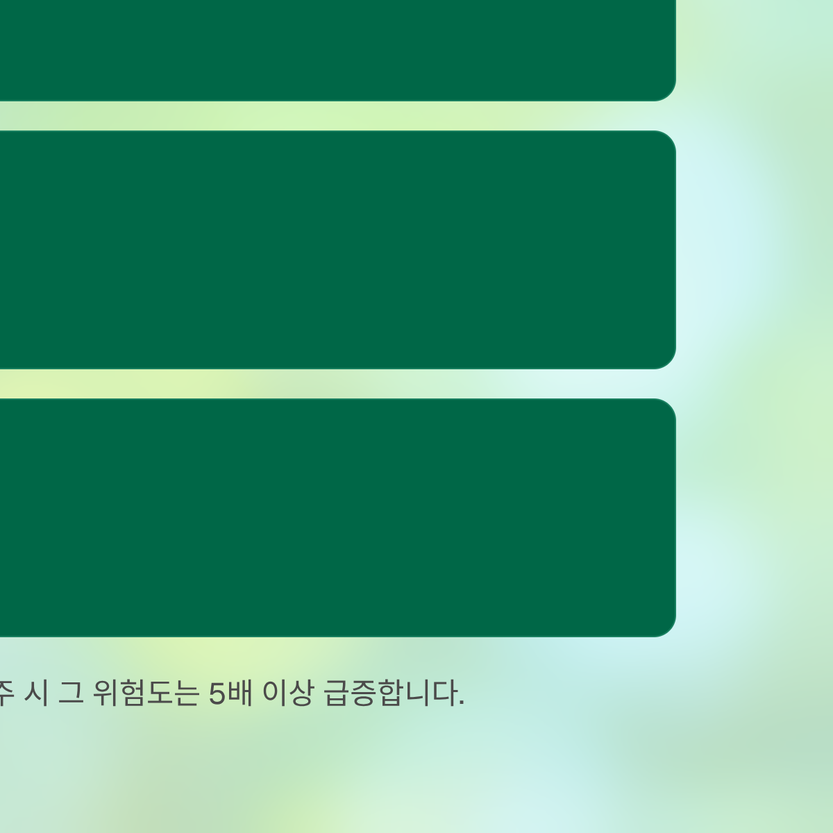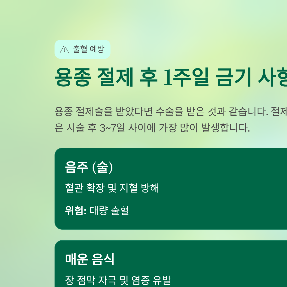 | 음주 (술) | 혈관 확장 및 지혈 방해 | 대량 출혈(Hemorrhage) | 매우 높음 |