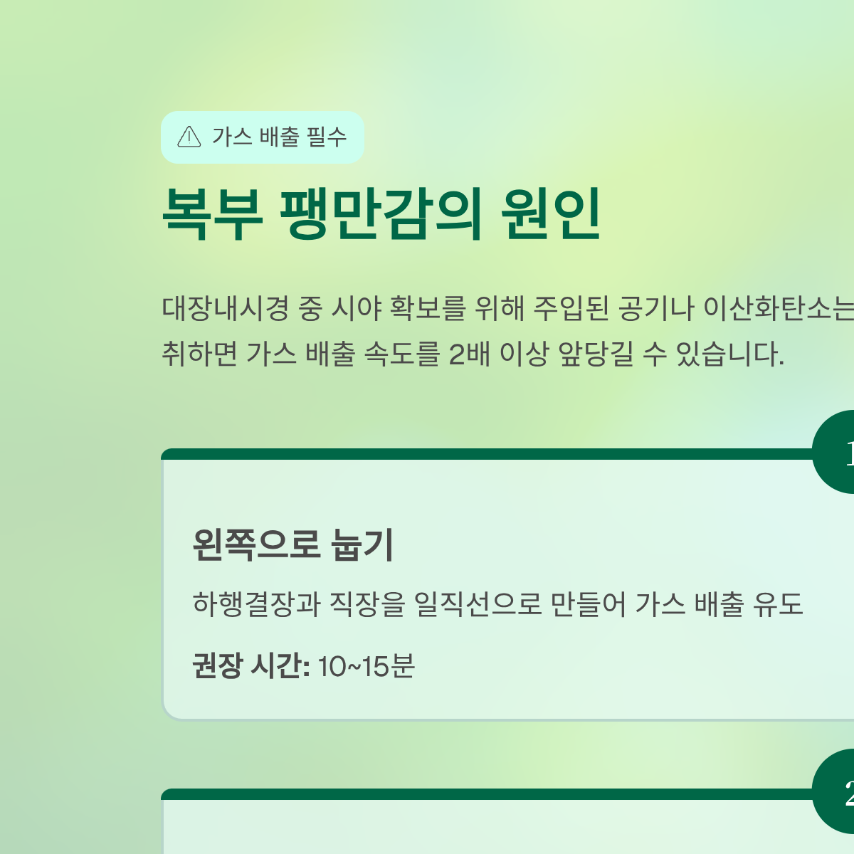 | 최우선 | 왼쪽으로 눕기 (Sim's position) | 하행결장과 직장을 일직선으로 만들어 가스 배출 유도 | 10~15분 |