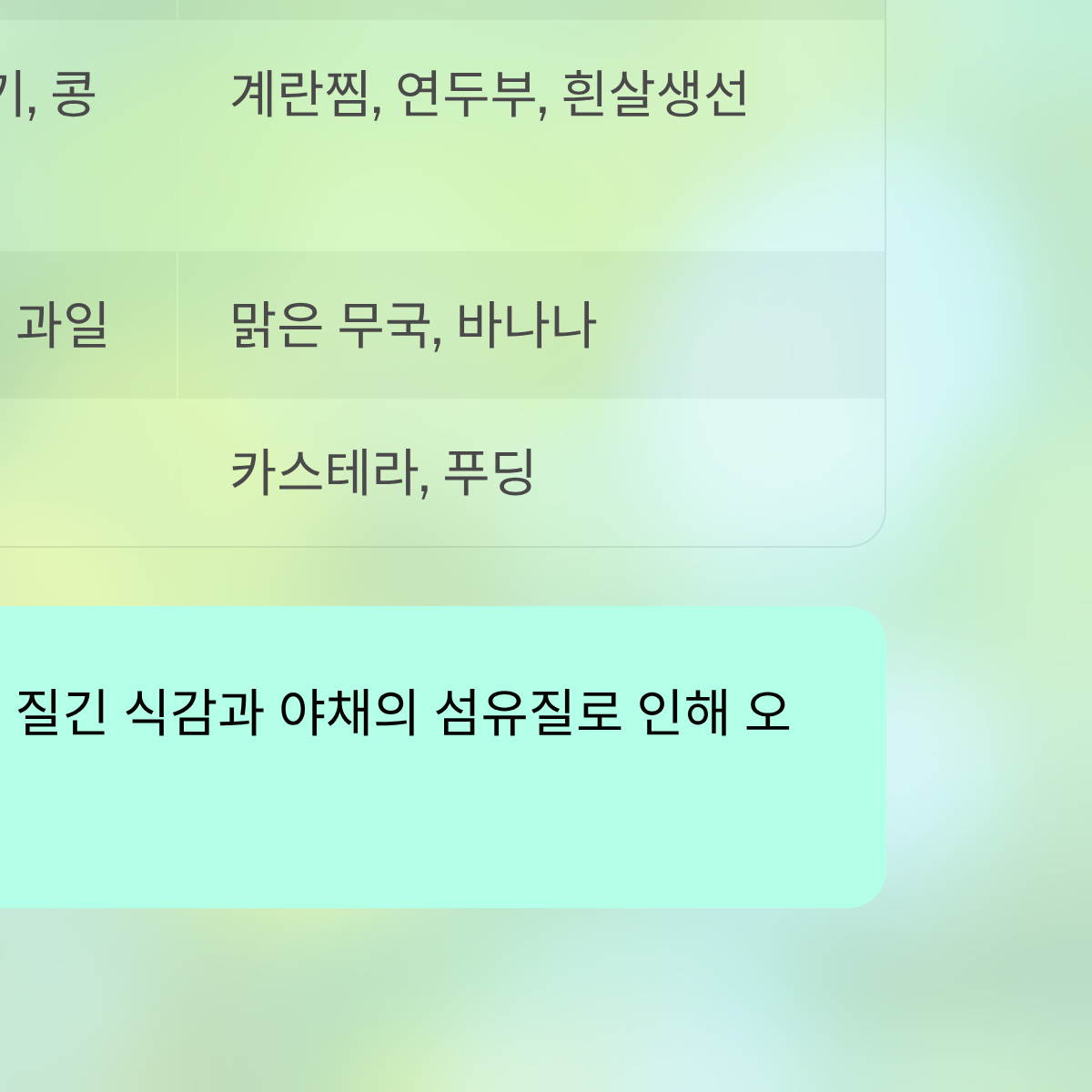 | 채소/과일 | 김치, 나물, 씨 있는 과일 | 맑은 무국(건더기 제외), 바나나 | 섬유질 찌꺼기가 없는가 |