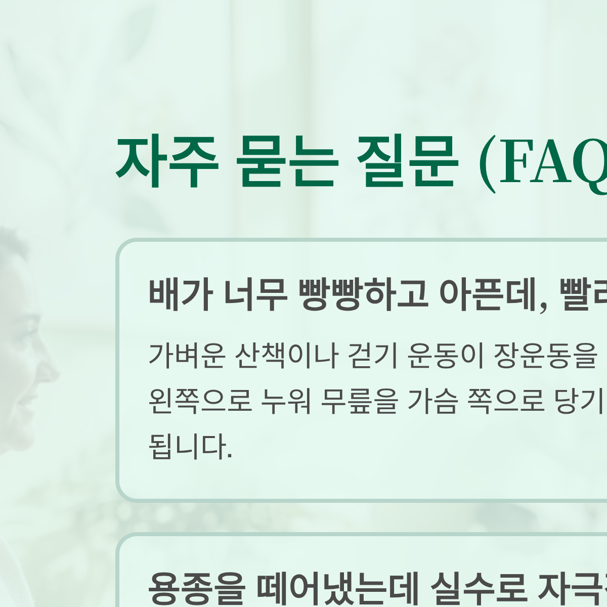 A: 가벼운 산책이나 걷기 운동이 장운동을 도와 가스 배출에 가장 효과적입니다. 또한 왼쪽으로 누워 무릎을 가슴 쪽으로 당기는 자세를 취하면 가스가 배출되는 통로가 확보되어 통증 완화에 도움이 됩니다.