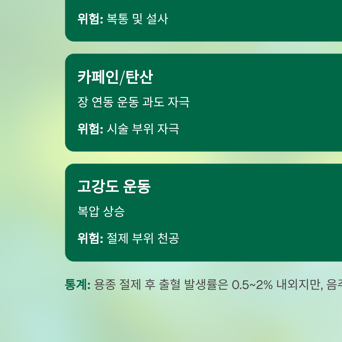 | 카페인/탄산 | 장 연동 운동 과도 자극 | 시술 부위 물리적 자극 | 보통 |