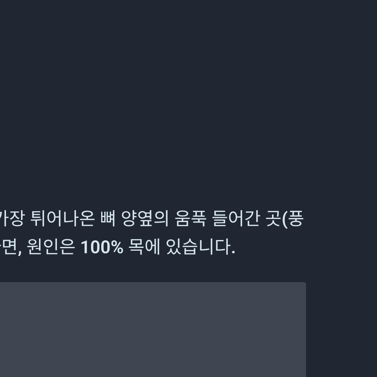 | 주요 통증 부위 | 목덜미 전체, 어깨 양측 | 뒷골 한쪽 쏠림 + 천골(꼬리뼈 위) 통증 | 하부 요통 동반 여부 |