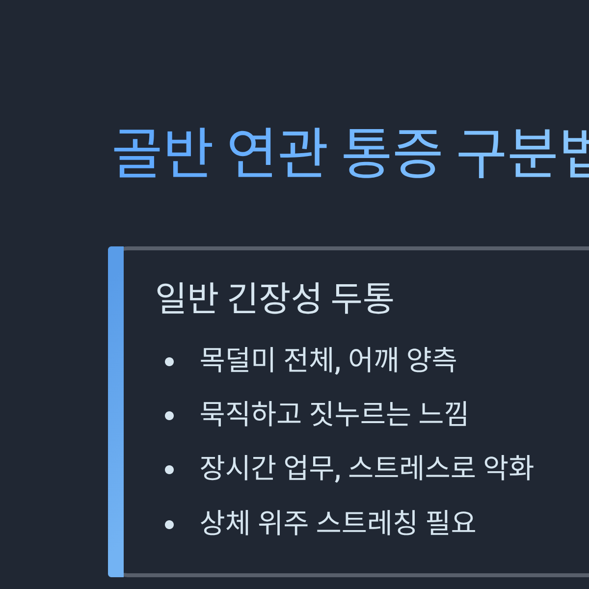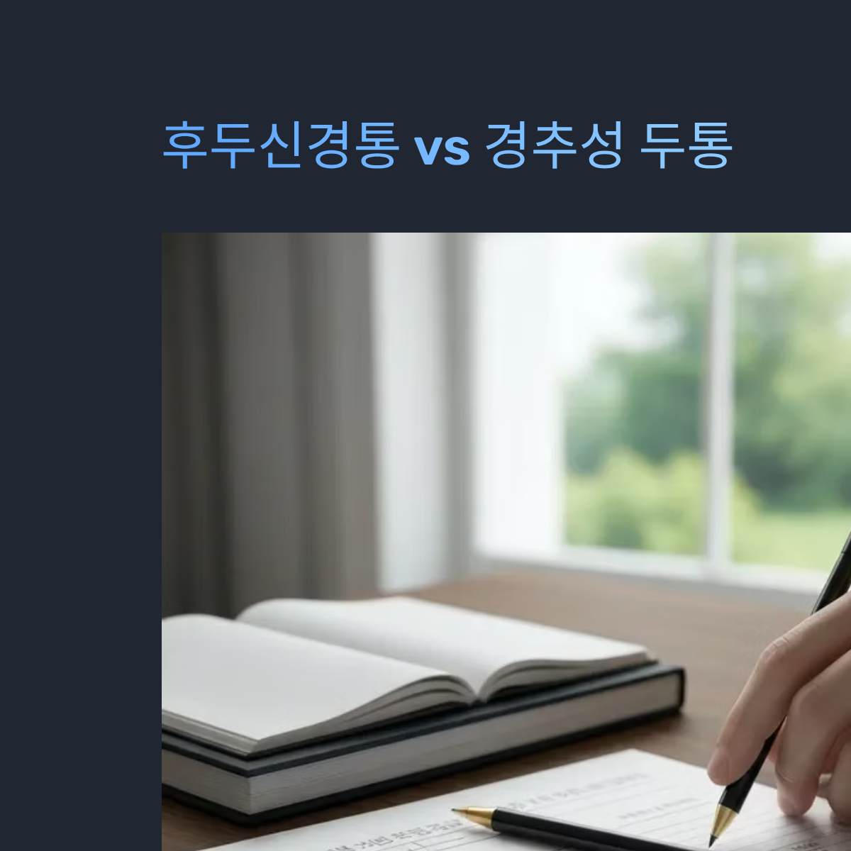 | 통증 양상 | 묵직하고 짓누르는 느낌 | 찌릿하며 당겨 올라오는 느낌 | 통증의 방향성 |