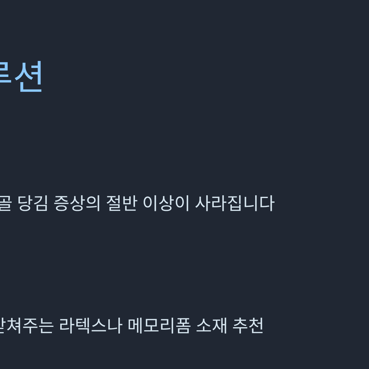 | 베개 높이(정면) | 6~8cm (목의 C자 커브 유지형) | 경추 신경 압박 완화 | 자고 일어났을 때 개운함 |