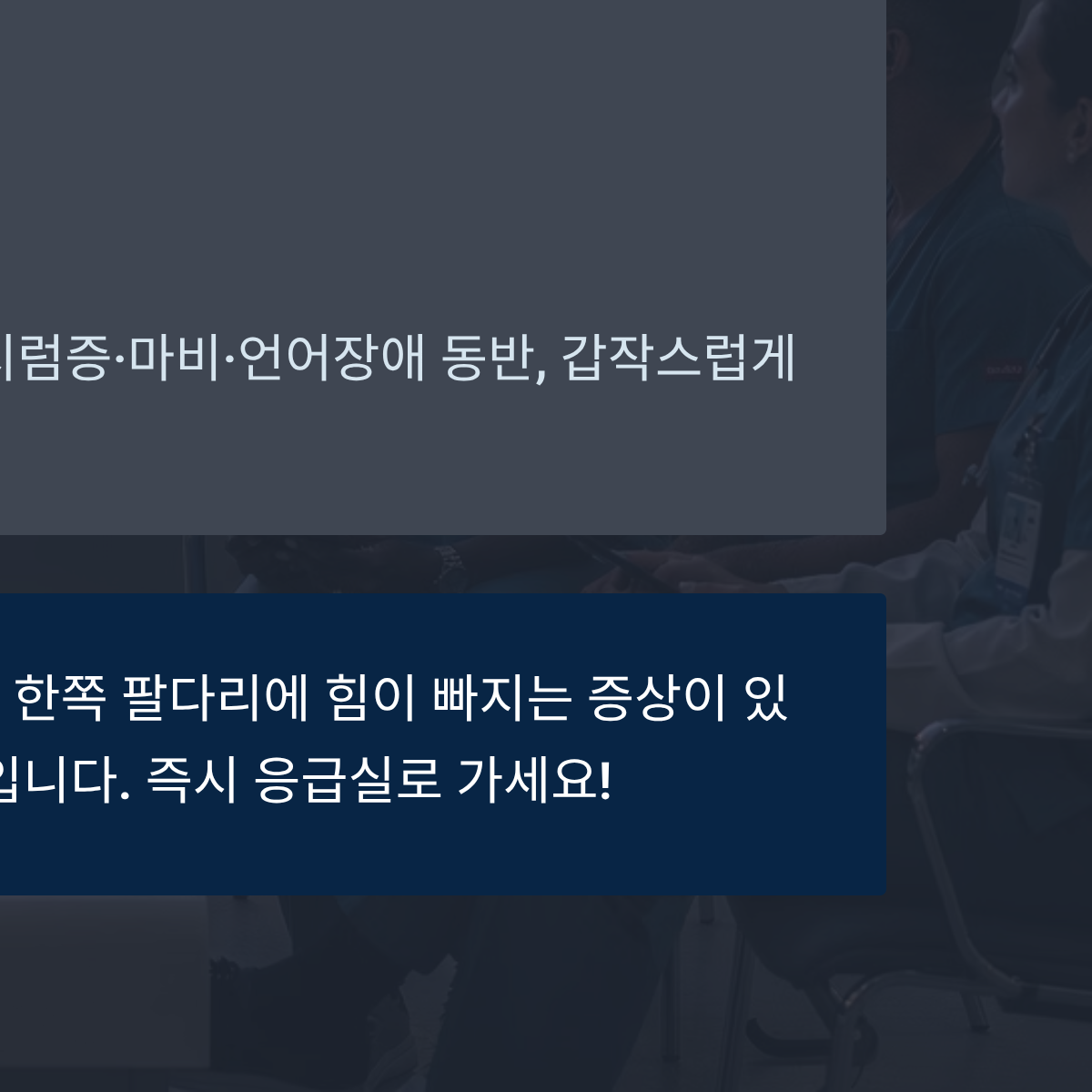 - [ ] 신경학적 결손: 한쪽 팔다리에 힘이 빠지거나 감각이 둔한가?