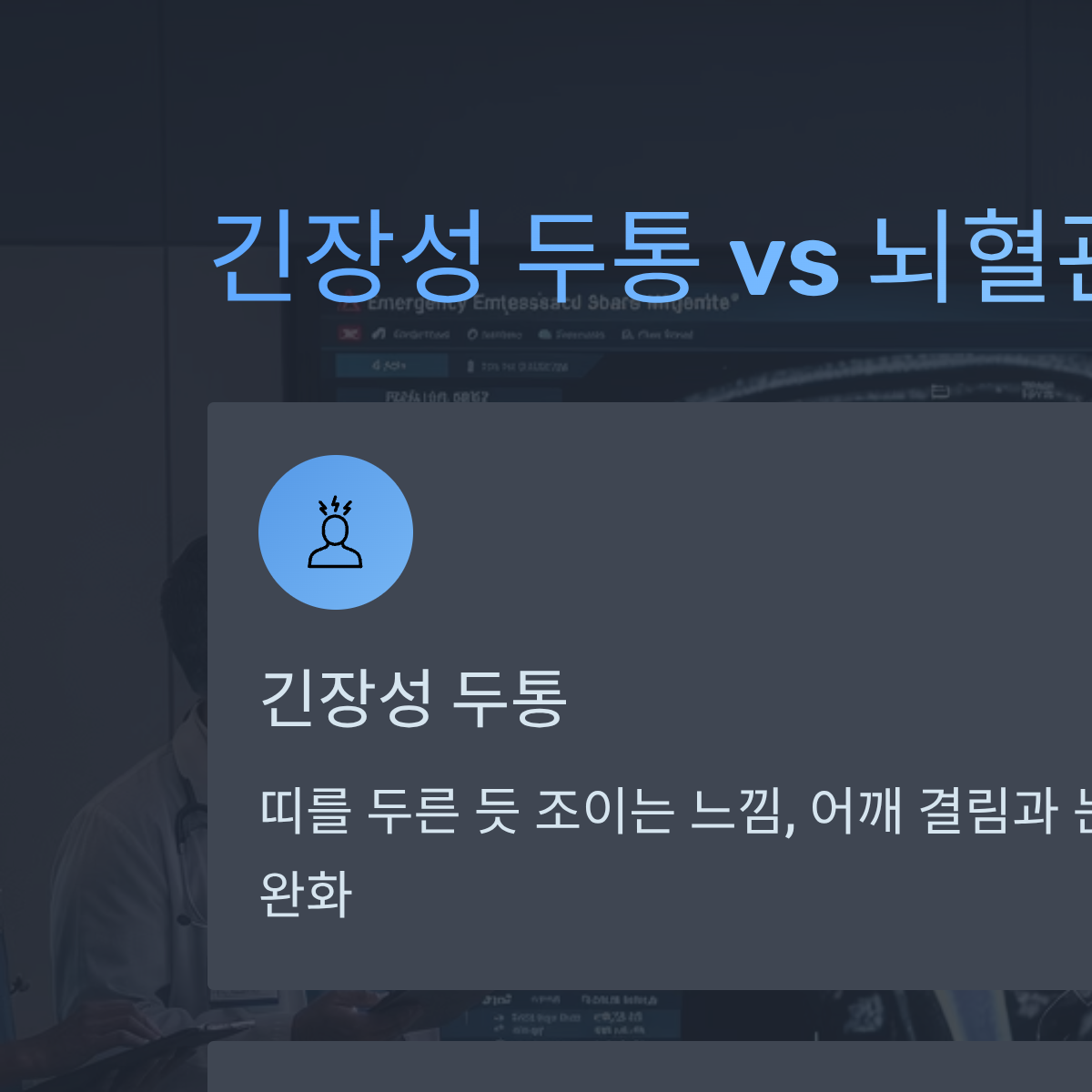 | 구분 항목 | 긴장성 두통 (단순 피로) | 뇌혈관 질환 (위험 신호) | 핵심 판단 기준 |