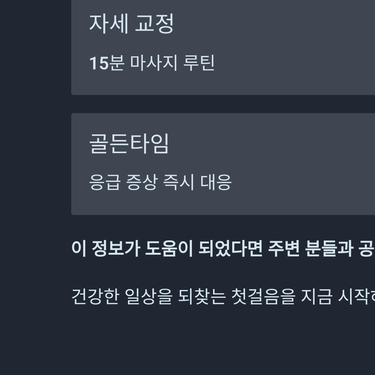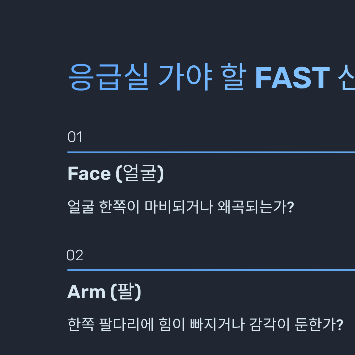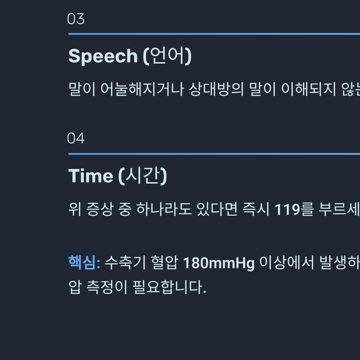 | 한눈에 결론 | 생활 습관 교정 필요 | 즉시 응급실 방문 요망 | 골든타임 사수 |