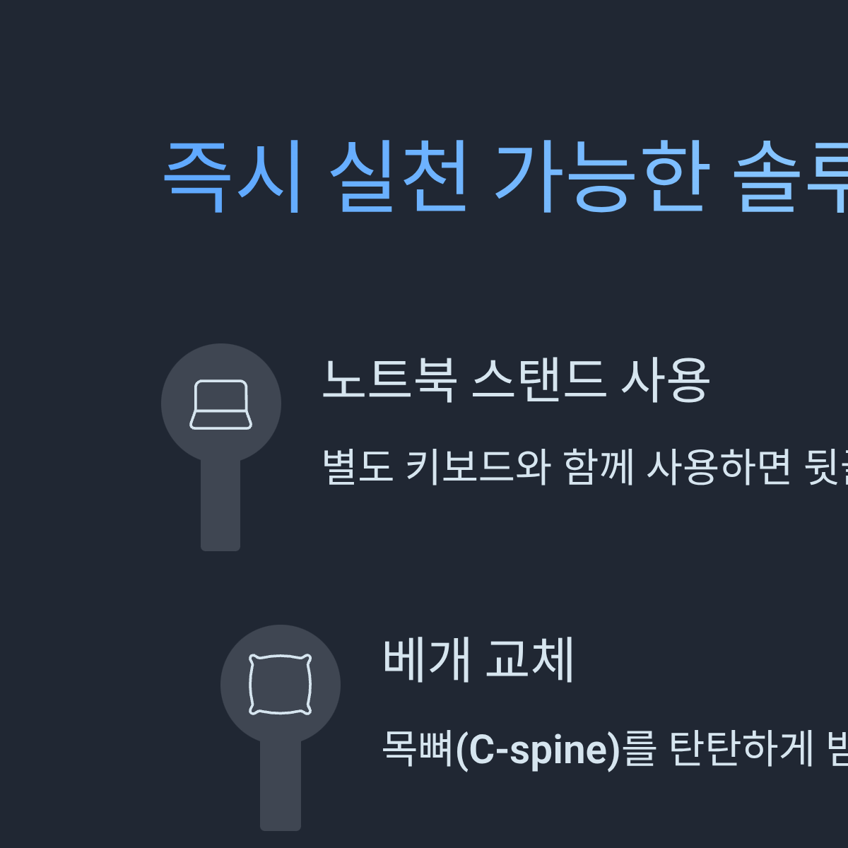 - 실전 적용 팁: 지금 당장 노트북 사용자라면 '노트북 스탠드'와 '별도 키보드'를 사용하세요. 이것만으로도 뒷골 당김 증상의 절반 이상이 사라집니다. 베개를 고를 때는 단순히 푹신한 것보다 목뼈(C-spine)를 탄탄하게 받쳐주는 라텍스나 메모리폼 소재를 추천합니다.