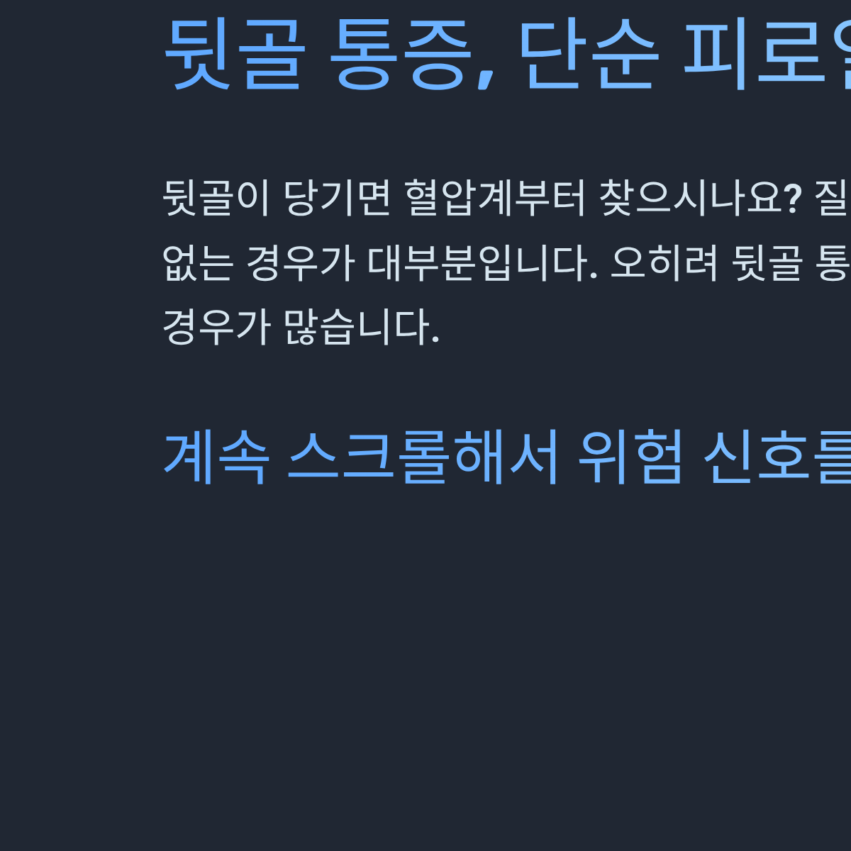 * 단순히 뒷골이 당기는 것 외에 '말이 어눌해지거나', '한쪽 팔다리에 힘이 빠지는' 증상이 있다면 1분 1초가 급한 뇌졸중 신호일 수 있습니다.
