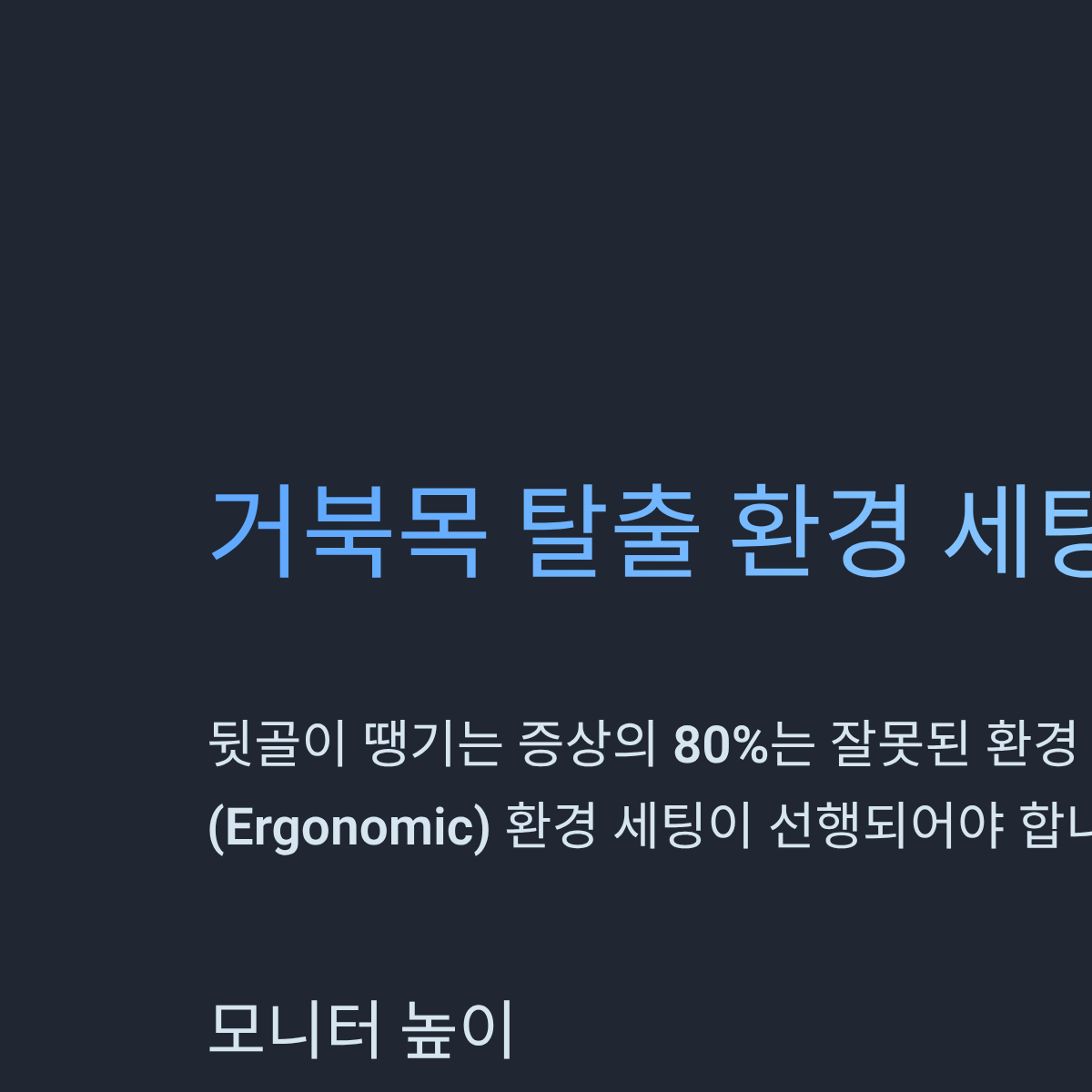 뒷골이 땡기는 증상의 80%는 잘못된 환경 설정에서 기인합니다. 제가 직접 모니터 높이를 10cm 높이고 베개를 교체한 것만으로 3년 넘게 달고 살던 후두신경통(Occipital Neuralgia, 뒷머리 신경 압박 통증)을 완치한 경험이 있습니다. 많은 분이 '바른 자세'를 의지만으로 해결하려 하지만, 사실은 인체공학적(Ergonomic) 환경 세팅이 선행되어야 합니다. 특히 거북목(Forward Head Posture)은 경추 1, 2번에 과도한 부하를 주어 뒷골 당김의 직접적인 원인이 됩니다.