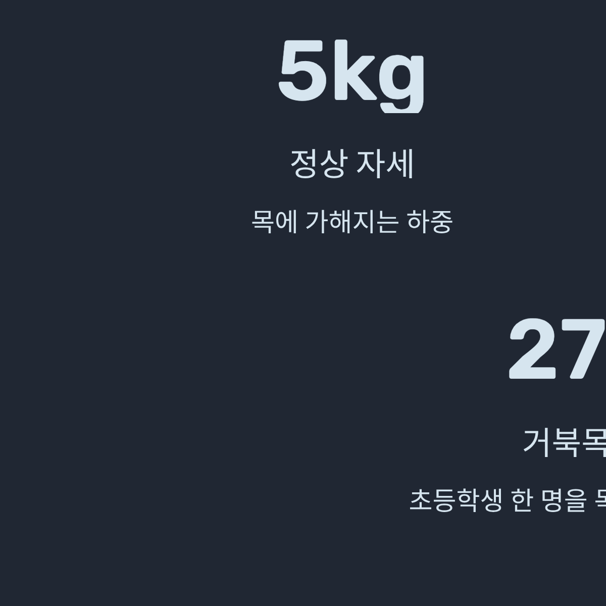 * 거북목 60도: 목에 가해지는 하중 약 27kg (초등학생 한 명을 목에 얹고 있는 무게)