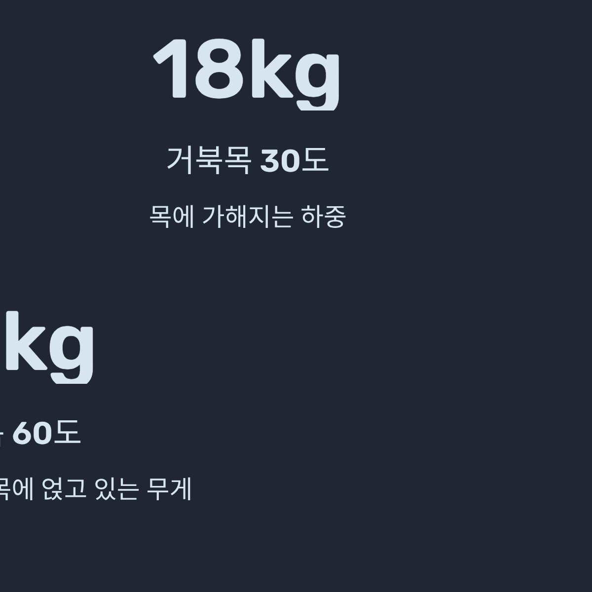 * 거북목 30도: 목에 가해지는 하중 약 18kg