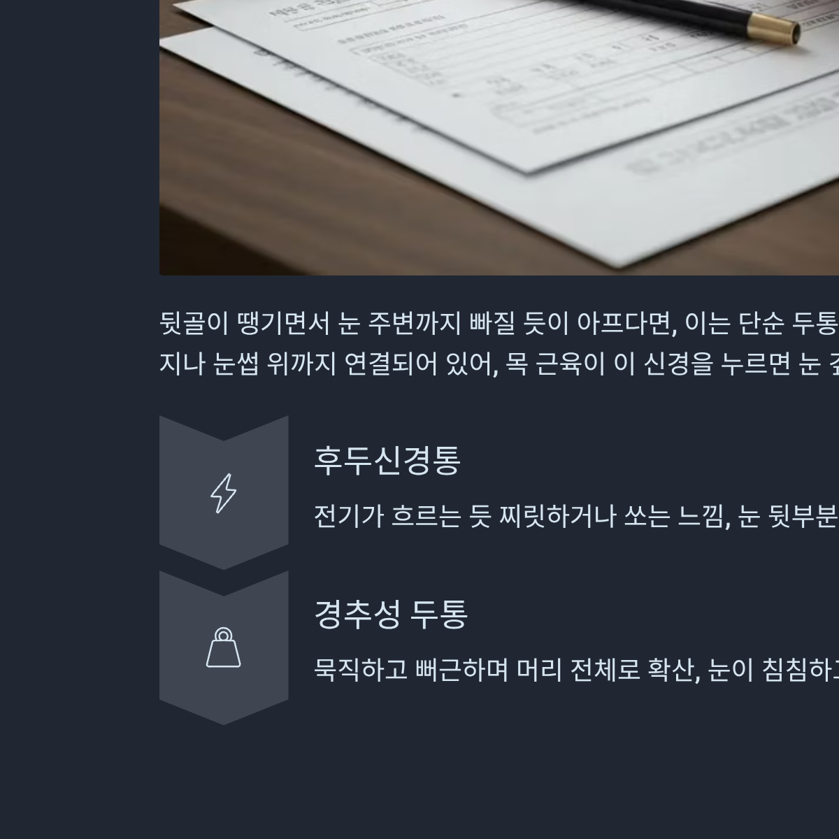 A: 이는 목 근육 긴장이나 후두신경 자극이 눈 주변 신경까지 영향을 주는 '연관통'일 가능성이 매우 높습니다. 안구 자체의 문제보다는 경추성 두통이나 후두신경통을 먼저 의심해보고 목 주변 근육을 이완하는 치료를 받는 것이 효과적입니다.