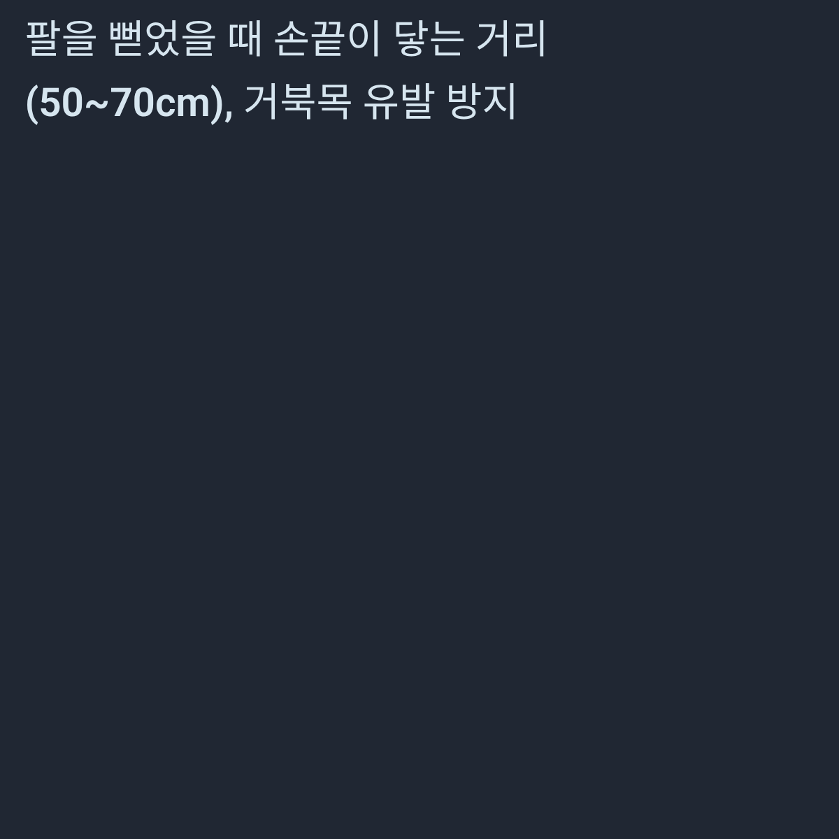 | 모니터 거리 | 팔을 뻗었을 때 손끝이 닿는 거리(50~70cm) | 거북목 유발 방지 | 고개가 앞으로 나가는가 |