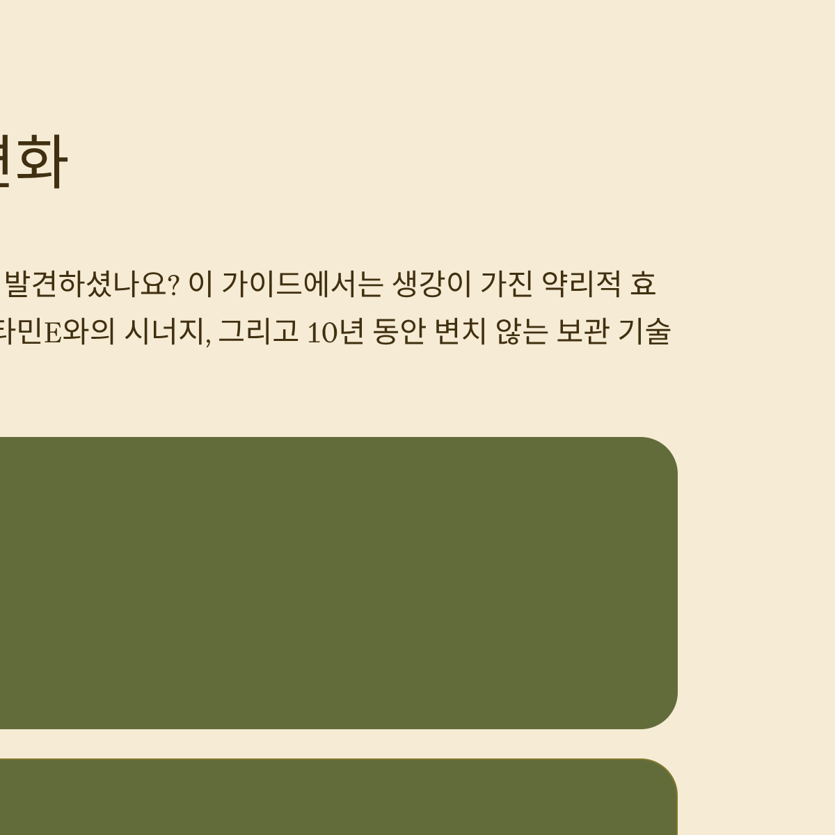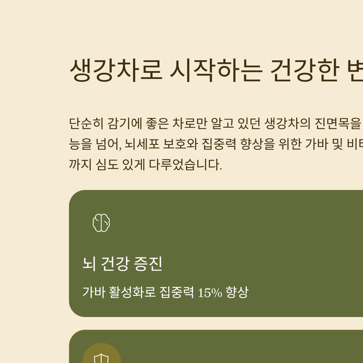단순히 감기에 좋은 차로만 알고 있던 생강차의 진면목을 발견하셨나요? 이번 가이드에서는 생강이 가진 약리적 효능을 넘어, 뇌 세포 보호와 집중력 향상을 위한 가바(GABA) 및 비타민E와의 시너지, 그리고 10년 동안 변치 않는 보관 기술까지 심도 있게 다루었습니다.