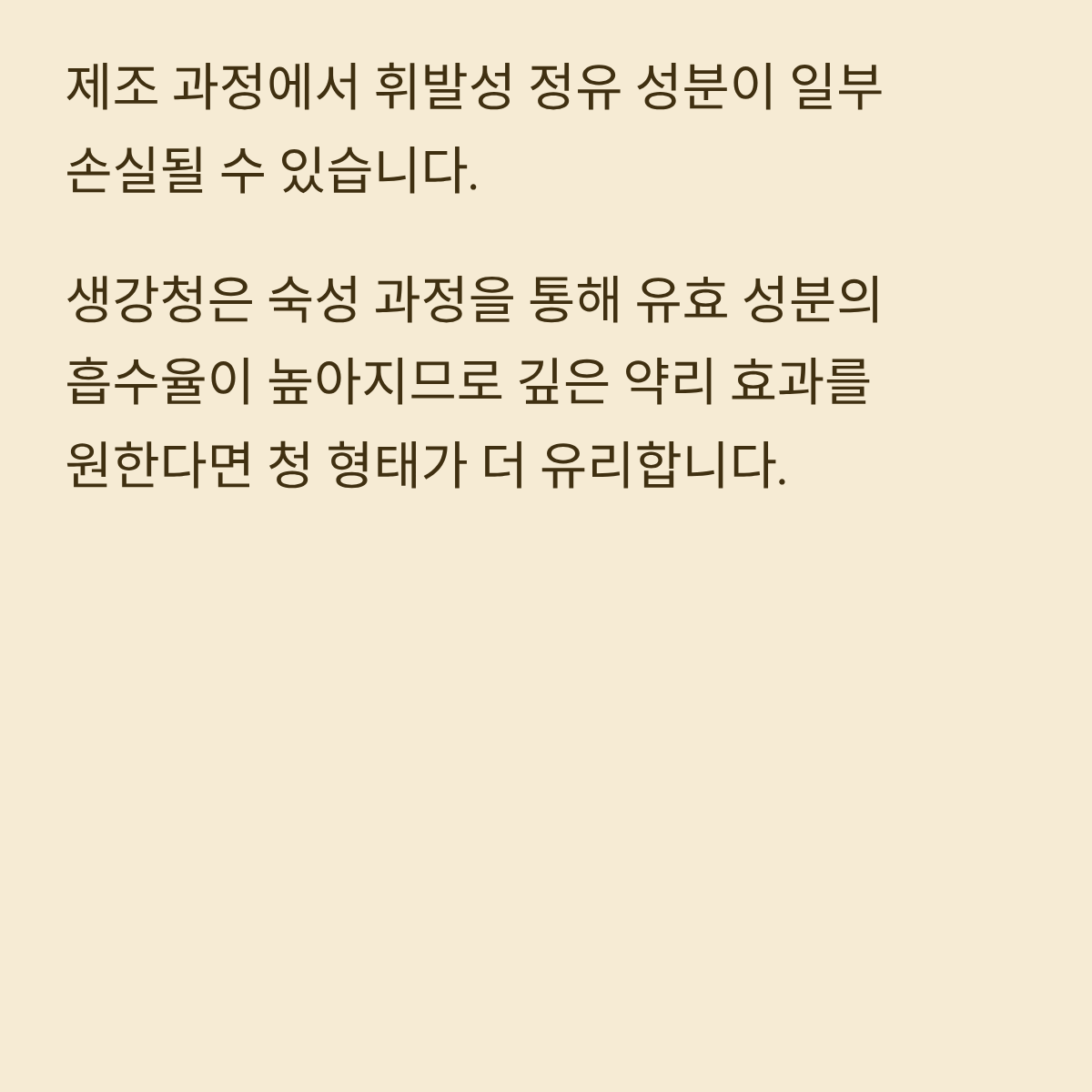 A: 생강 가루는 농축된 성분을 빠르게 섭취할 수 있다는 장점이 있지만, 제조 과정에서 휘발성 정유 성분이 일부 손실될 수 있습니다. 생강청은 숙성 과정을 통해 유효 성분의 흡수율이 높아지므로 깊은 약리 효과를 원한다면 청 형태가 더 유리합니다.