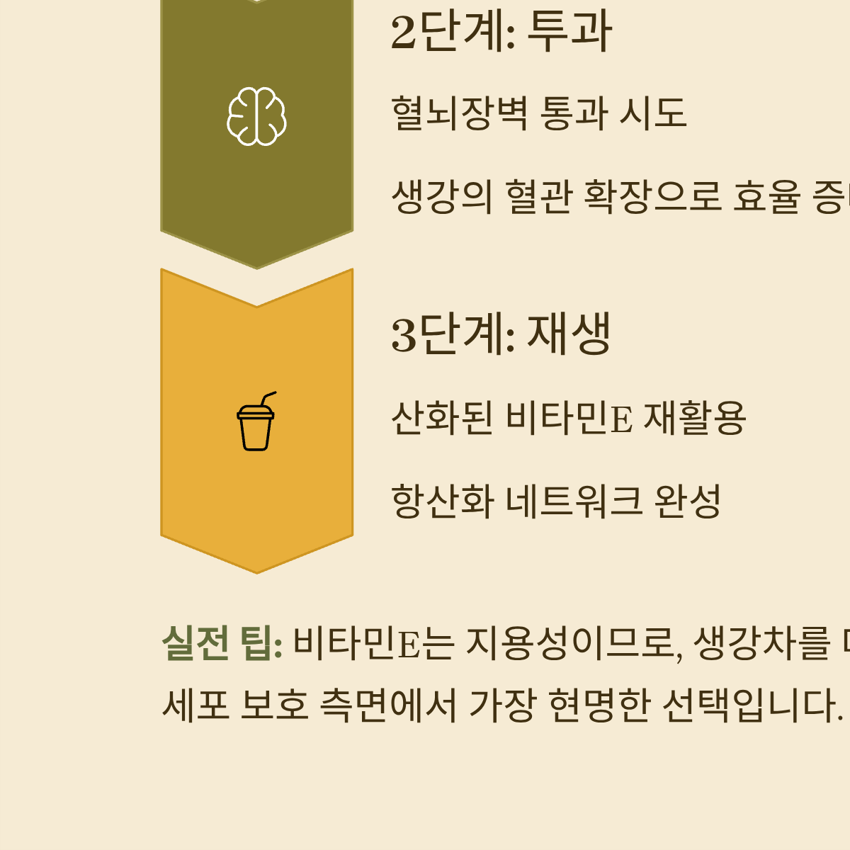 | 3단계: 재생 | 산화된 비타민E의 재활용 필요 | 비타민C와 협력하여 비타민E 재생 보조 | 항산화 네트워크 완성 |