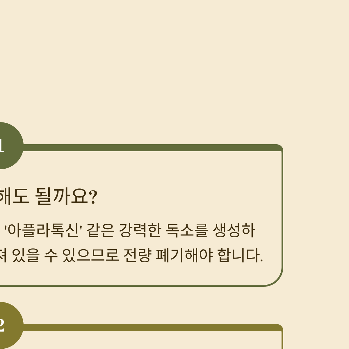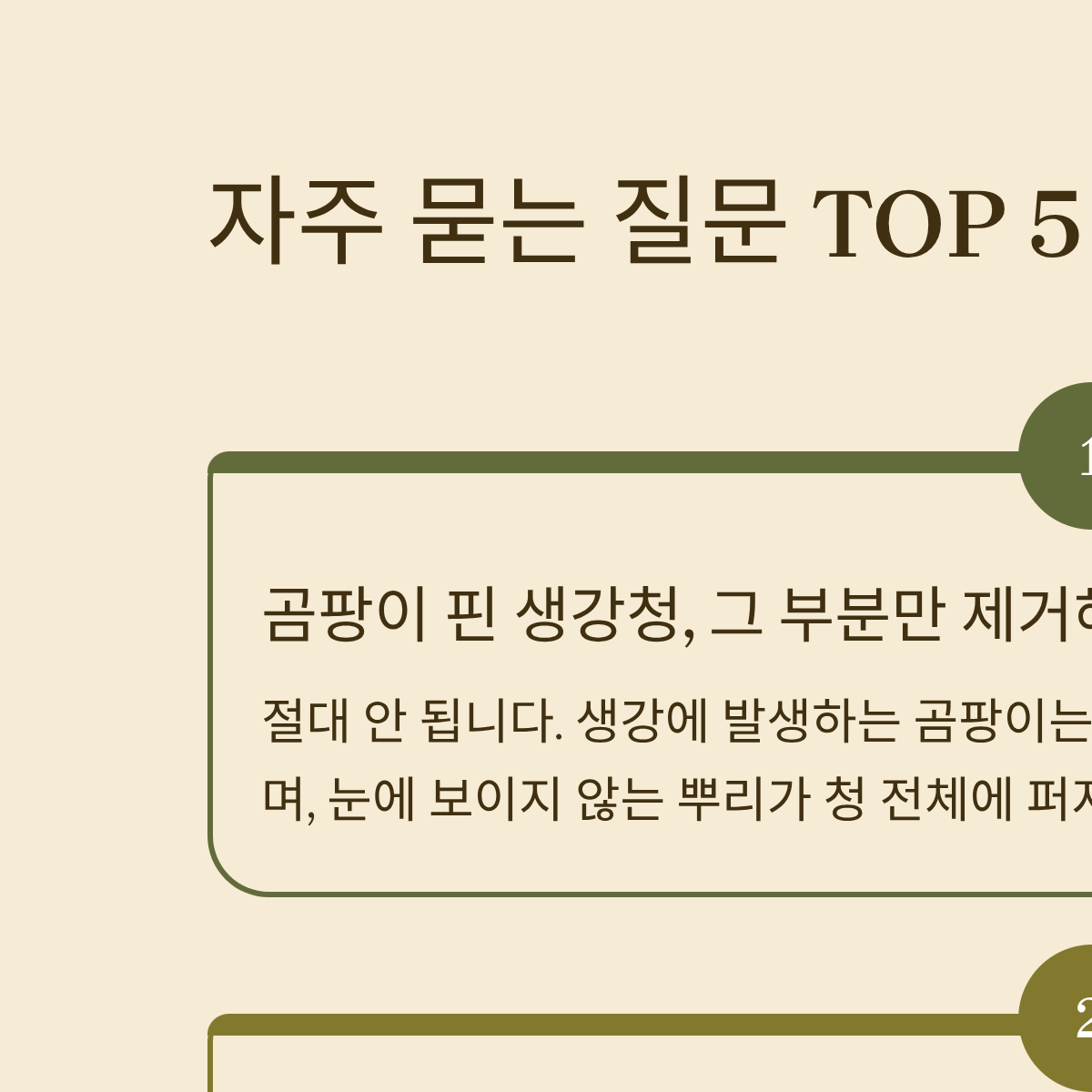 A: 절대 안 됩니다. 생강에 발생하는 곰팡이는 '아플라톡신' 같은 강력한 독소를 생성하며, 눈에 보이지 않는 뿌리가 청 전체에 퍼져 있을 수 있으므로 전량 폐기해야 합니다.