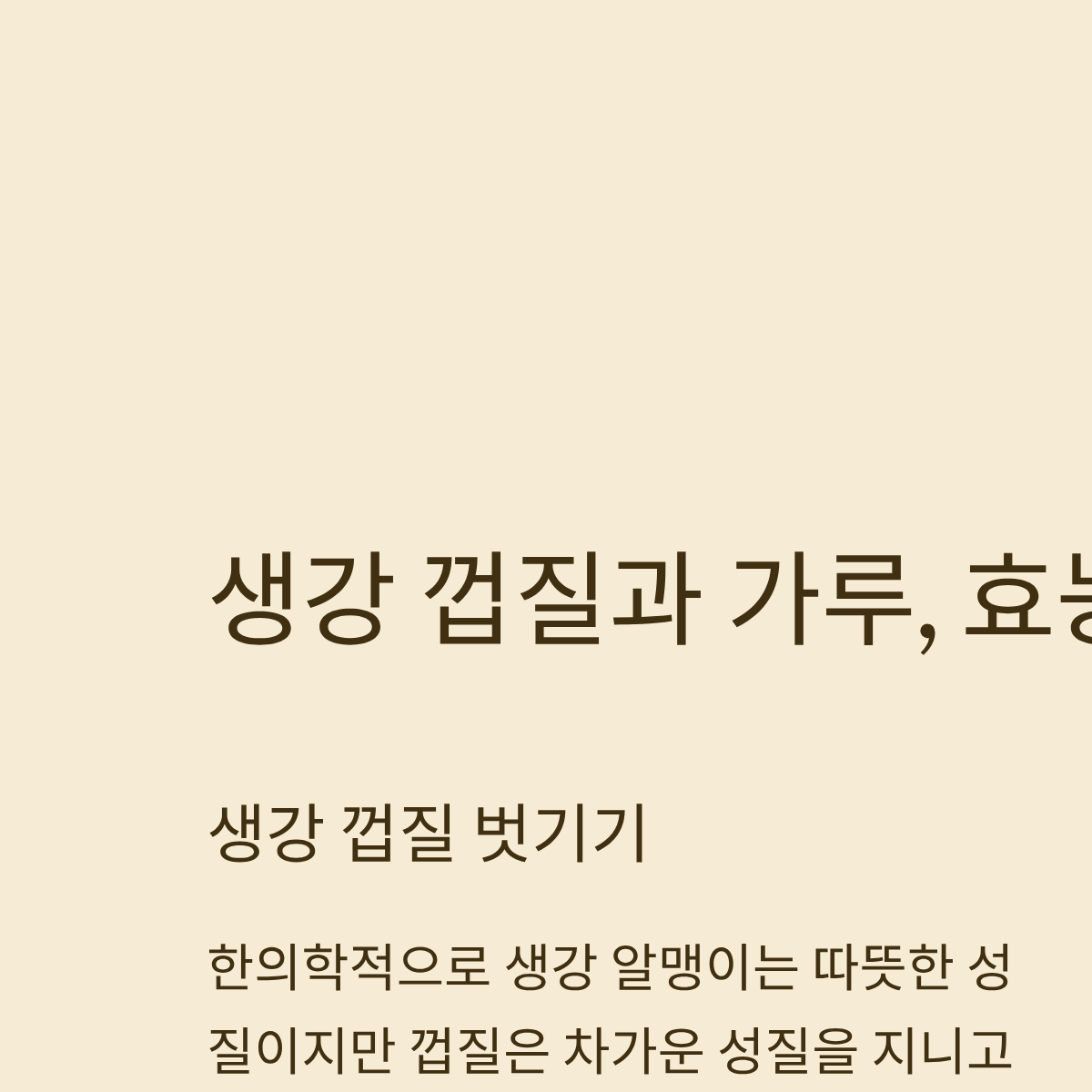 A: 한의학적으로 생강 알맹이는 따뜻한 성질이지만 껍질은 차가운 성질을 지니고 있어, 몸을 따뜻하게 하려는 목적이라면 껍질을 벗기는 것이 좋습니다. 또한 껍질 사이의 이물질 제거를 위해서도 깨끗이 손질하는 것을 권장합니다.
