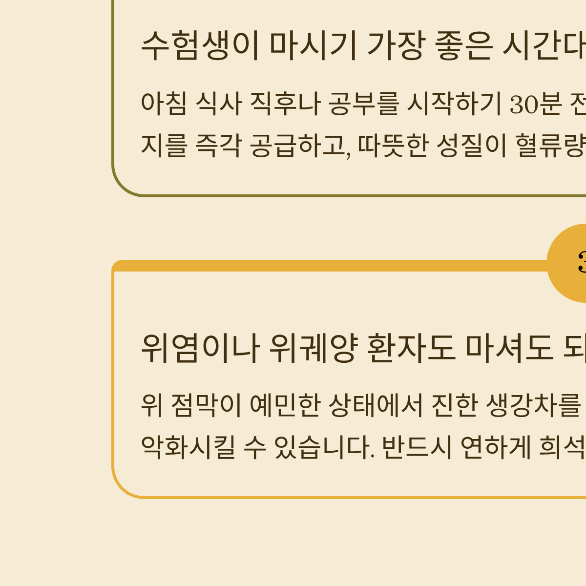 * 생강차는 카페인 없이도 뇌 혈류량을 늘려 '브레인 포그(Brain Fog, 머리가 멍한 현상)'를 제거하는 데 효과적입니다.