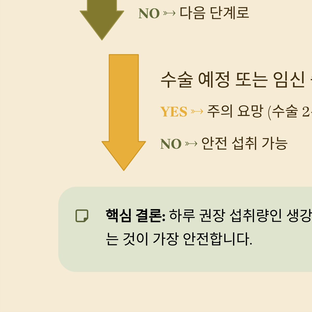 - YES → 주의 요망 (수술 2주 전부터 중단, 임산부는 하루 1g 미만 제한)