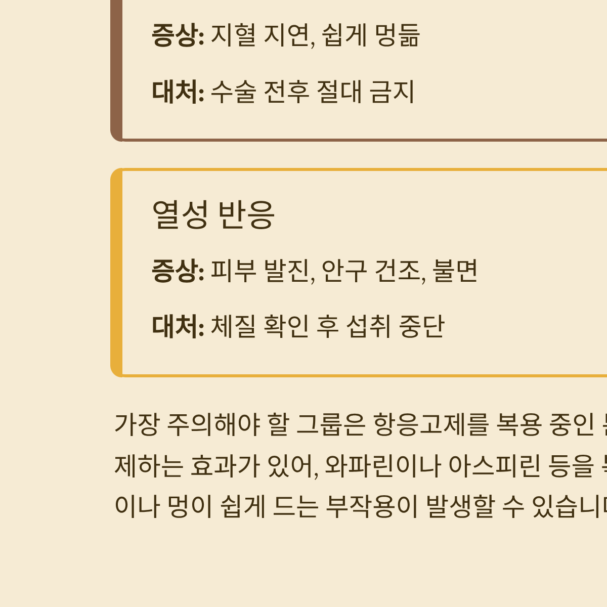 | 혈액 응고 저해 | 지혈 지연, 쉽게 멍듦 | 수술 전후 절대 금지 |