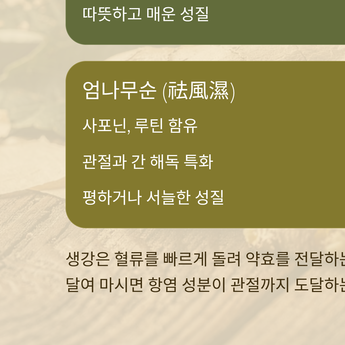 * 생강은 혈류를 빠르게 돌려 약효를 전달하는 '부스터' 역할을 하므로, 엄나무순과 함께 달여 마시면 엄나무의 항염 성분이 관절 마디까지 도달하는 속도를 높일 수 있습니다.