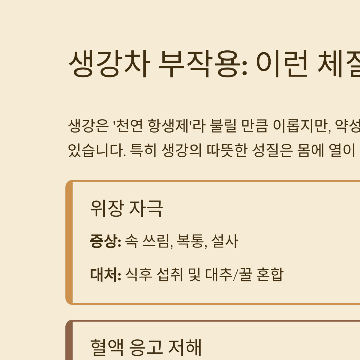 A: 위 점막이 예민한 상태에서 진한 생강차를 마시면 오히려 속 쓰림을 유발하고 증상을 악화시킬 수 있습니다. 반드시 연하게 희석하여 마시거나 식후에 소량만 섭취하며 상태를 살펴야 합니다.