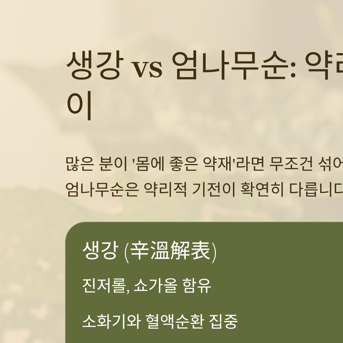 많은 분이 '몸에 좋은 약재'라면 무조건 섞어 마시는 실수를 범하곤 합니다. 하지만 생강(Ginger)과 엄나무순(Kalopanax septemlobus)은 약리적 기전이 확연히 다릅니다. 생강은 '신온해표(辛溫解表, 매운맛과 따뜻한 성질로 겉의 사기를 내보냄)'의 대명사로 소화기와 혈액순환에 집중하는 반면, 엄나무순은 '거풍습(祛風濕, 풍과 습을 제거함)'에 특화되어 관절과 간 해독에 강점을 보입니다.