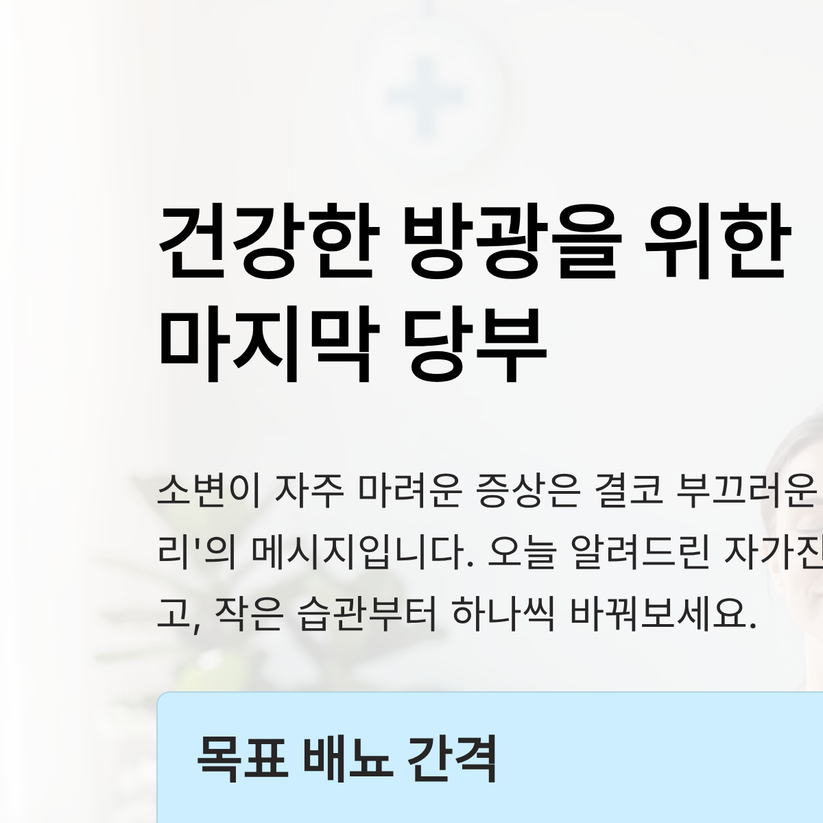 - [ ] 방광 훈련: 요의가 느껴질 때 5~10분씩 참으며 배뇨 간격 늘리기 (최종 목표 3~4시간)