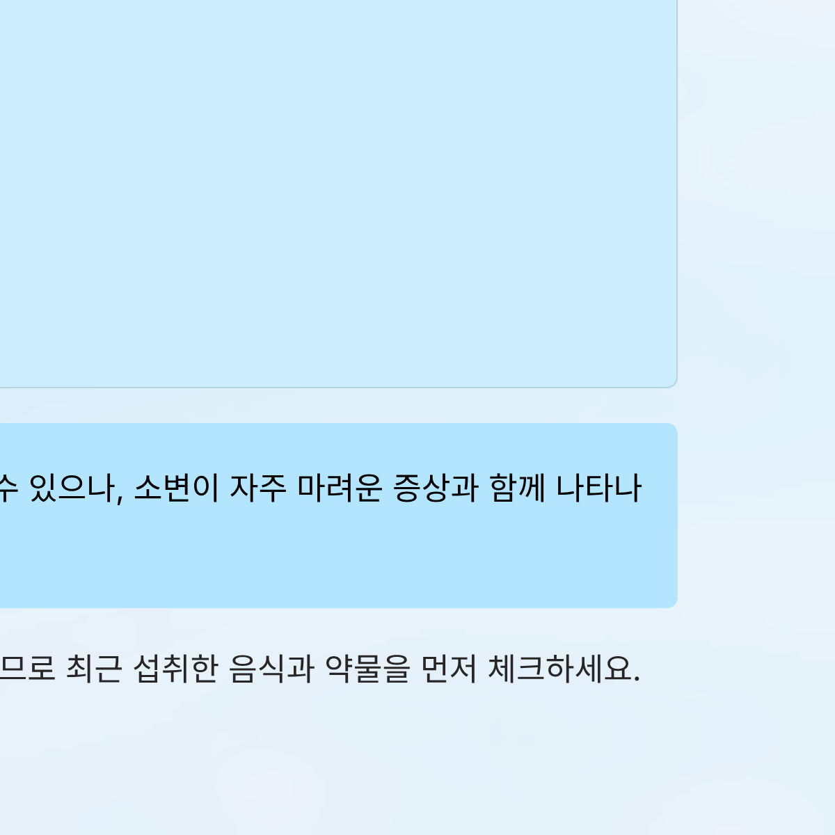 | 비트(Beets) | 분홍색 ~ 붉은색 | 대변 색도 함께 붉어질 수 있음 | 음식 섭취 중단 시 소멸 |