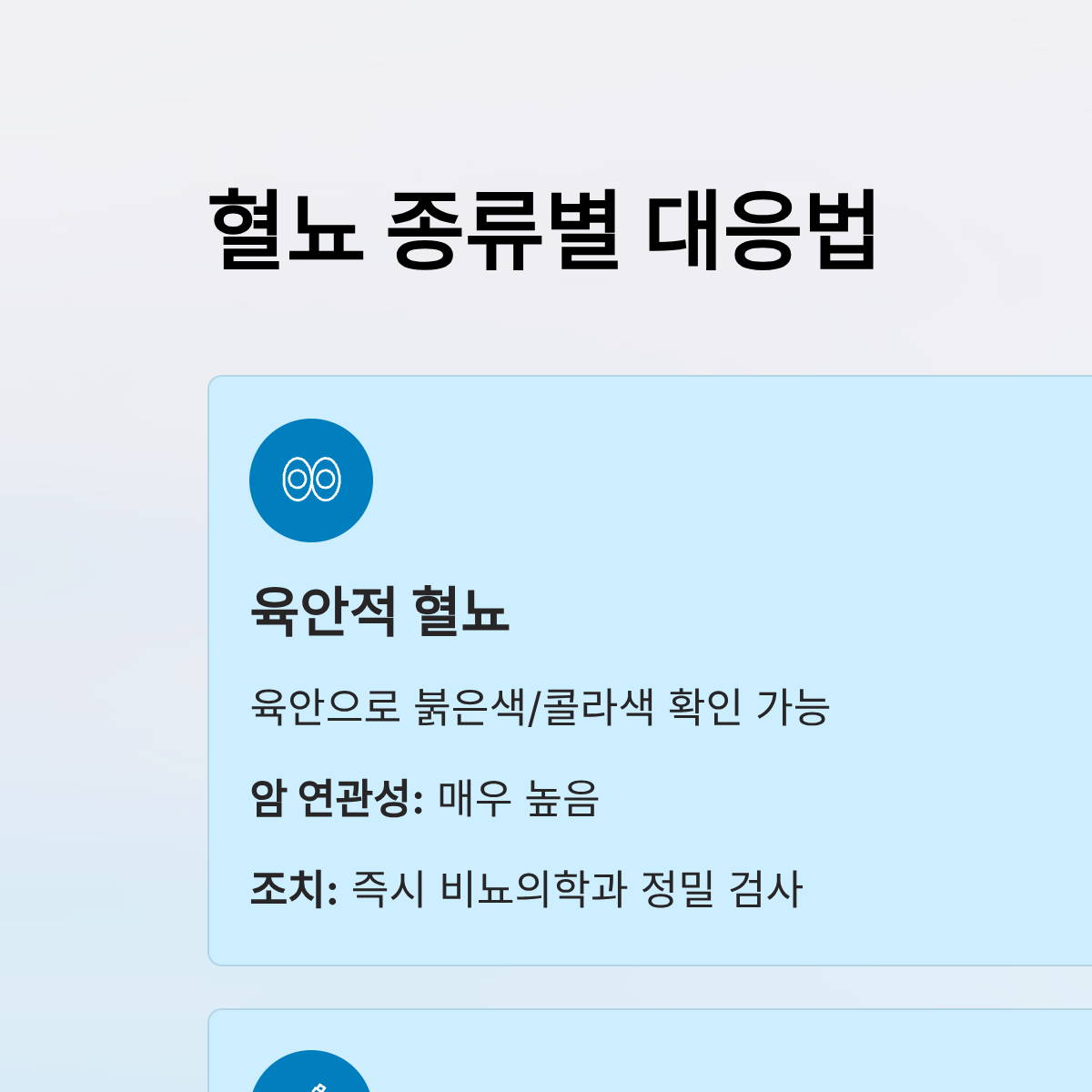 특히 '통증 없는 육안적 혈뇨'는 방광암의 전형적인 신호일 수 있어 주의가 필요합니다. 다음 의사결정 트리를 통해 현재 상황에서 어떤 조치가 필요한지 확인하세요.