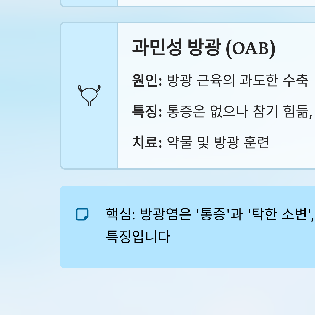 - 표에서 주목할 점: 방광염은 세균 감염이 주원인이므로 통증이 동반되는 경우가 많습니다.