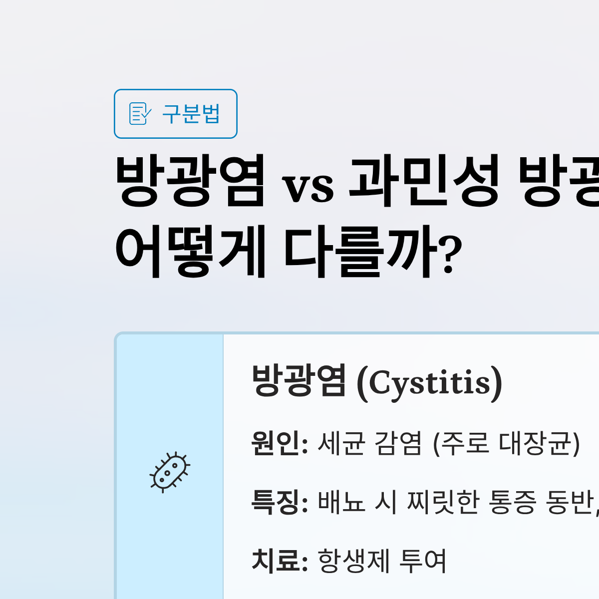 단순히 화장실을 자주 가는 것과 염증성 질환인 방광염은 '통증'과 '잔뇨감'에서 큰 차이를 보입니다. 아래 표를 통해 현재 자신의 상태를 즉시 점검해 보시기 바랍니다.